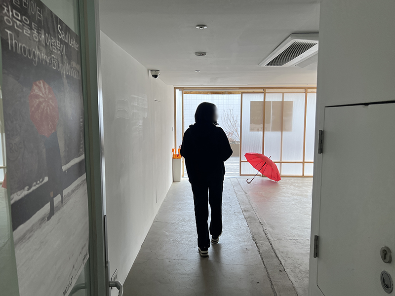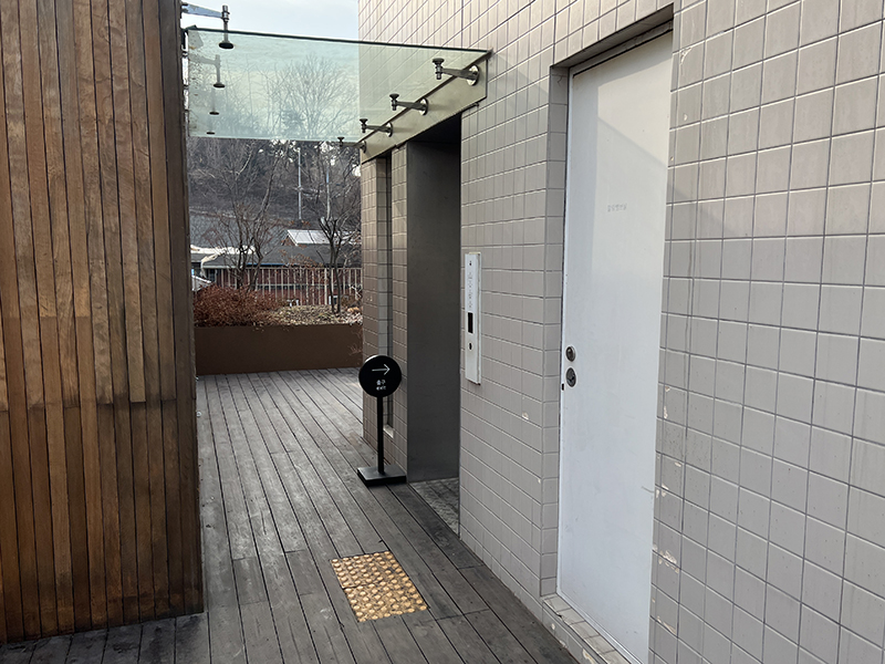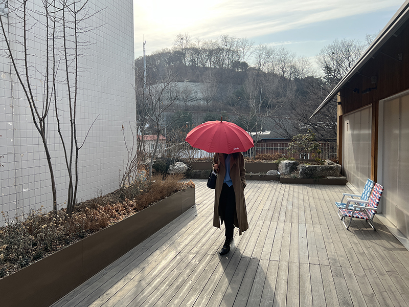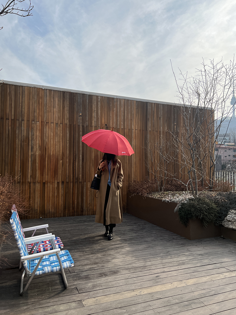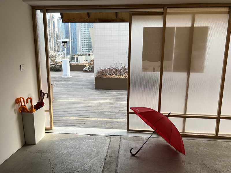 빨간 우산과 함께 기념사진 남기고 루프탑에 있는 엘리베이터로 내려가면