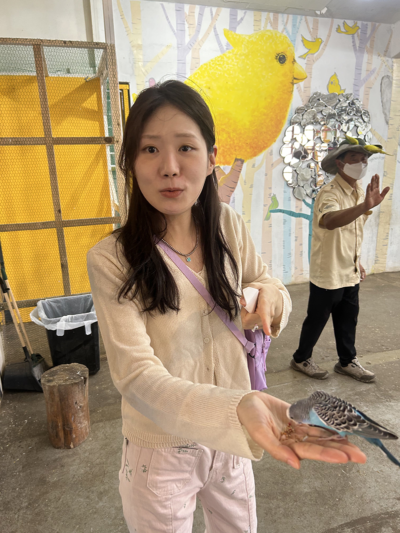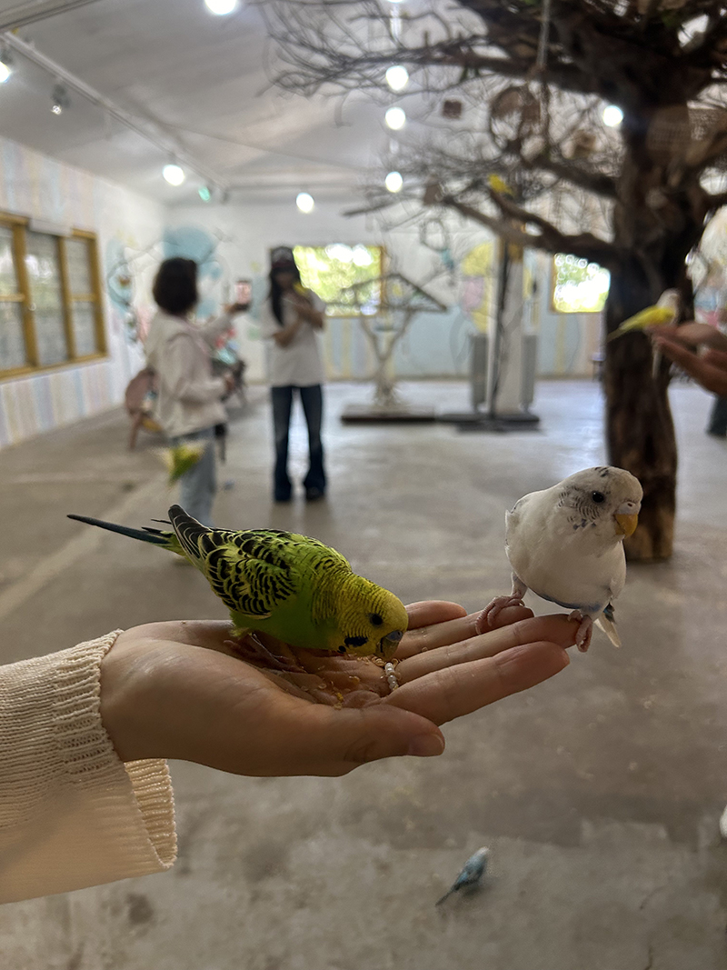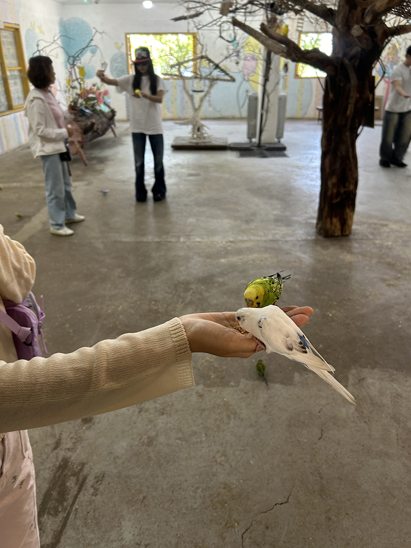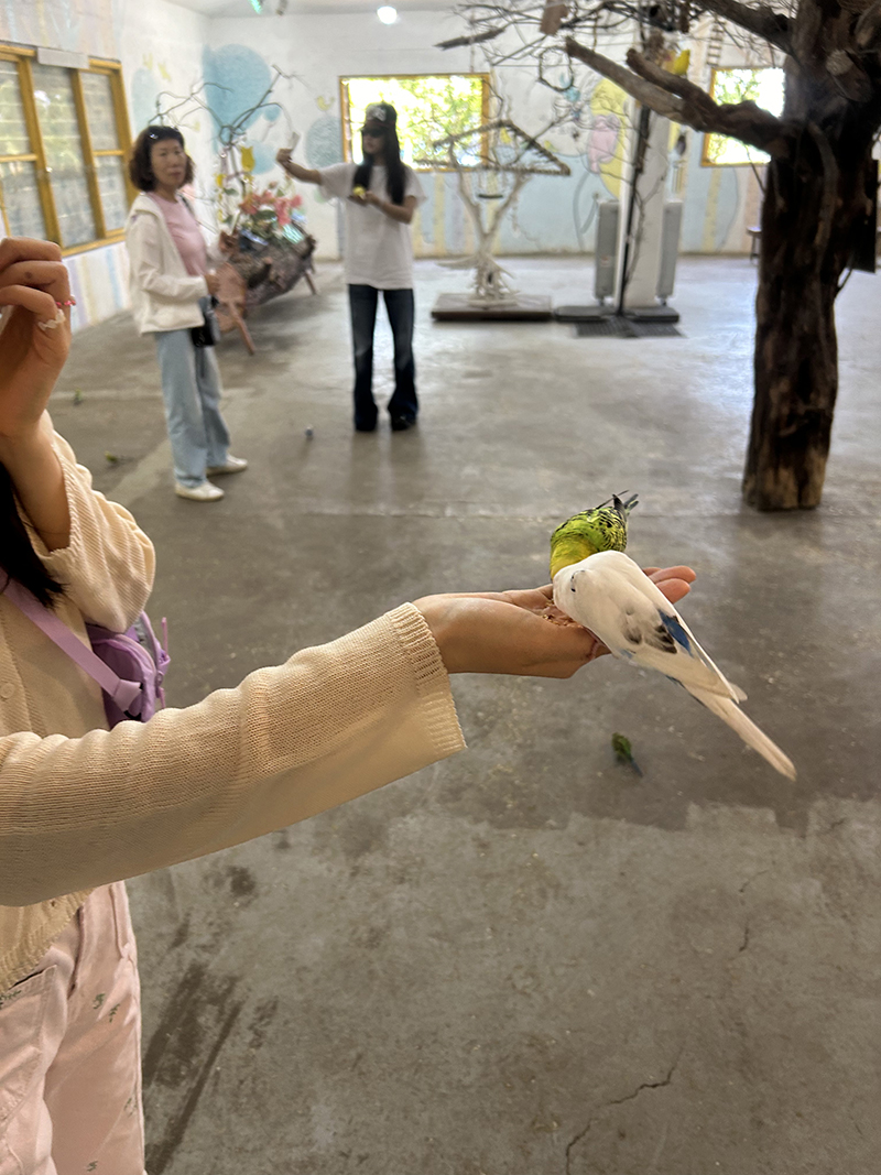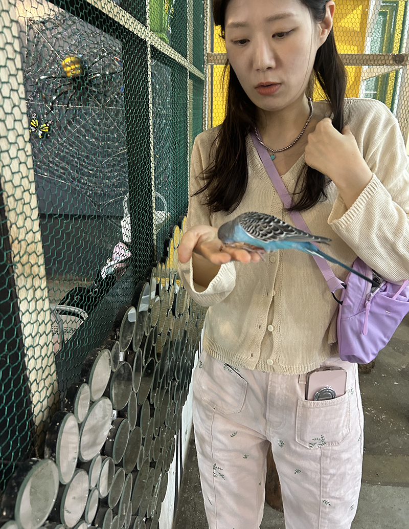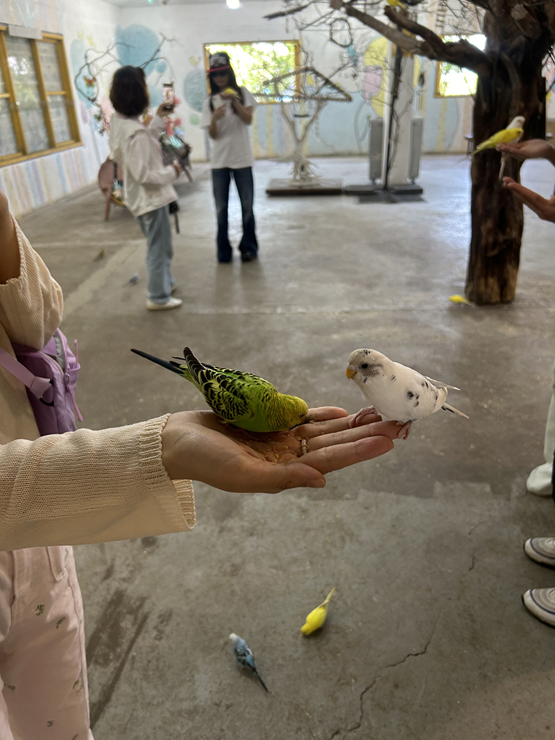 손바닥에 사료 올려서 새들테 주는건데 첨에 너무 무서웠는데