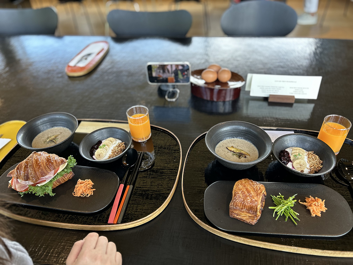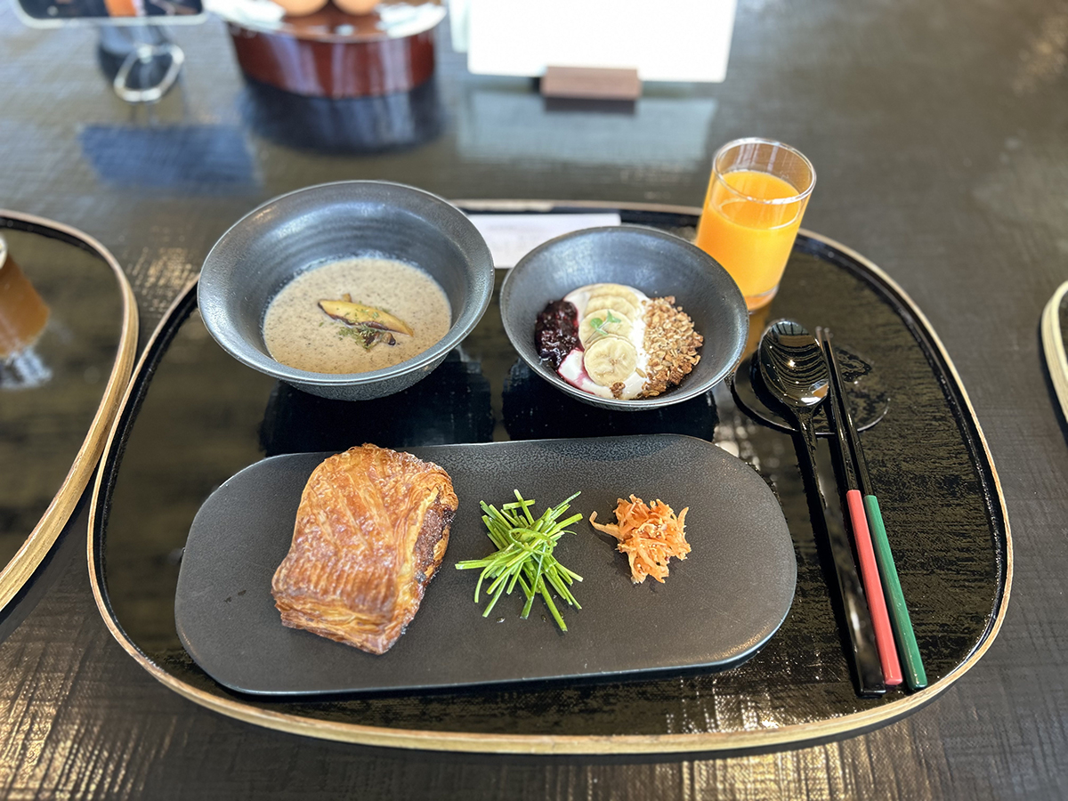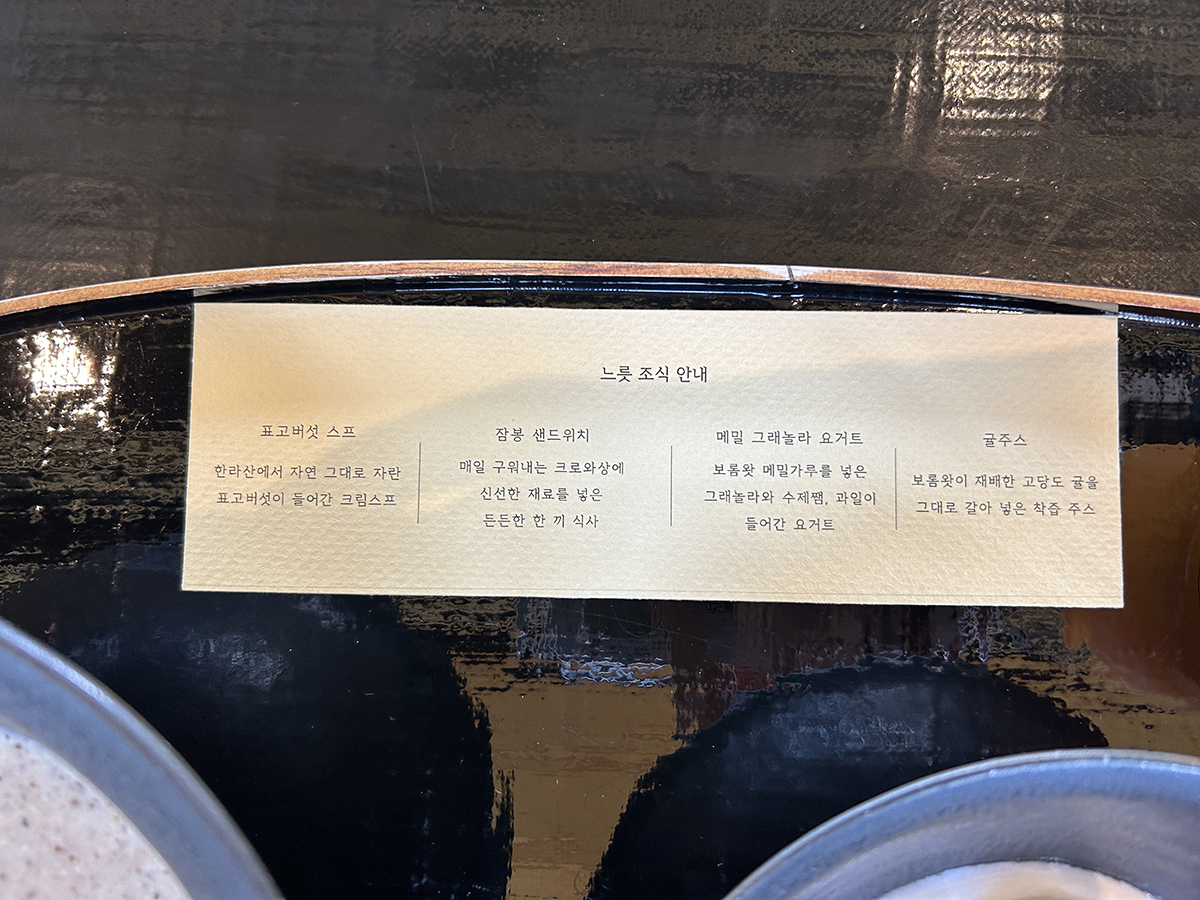 표고버섯 스프, 메밀 그래놀라 요거트, 귤주스가 함께 나온다