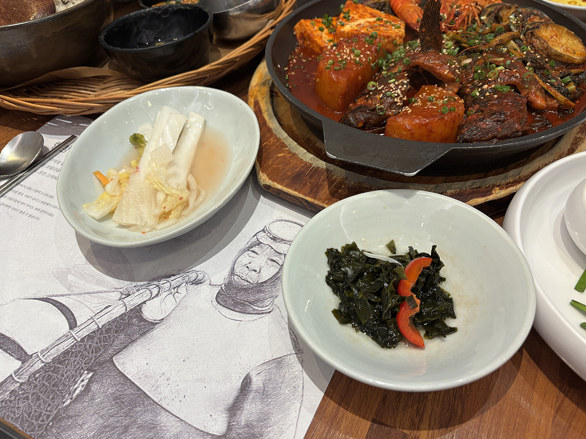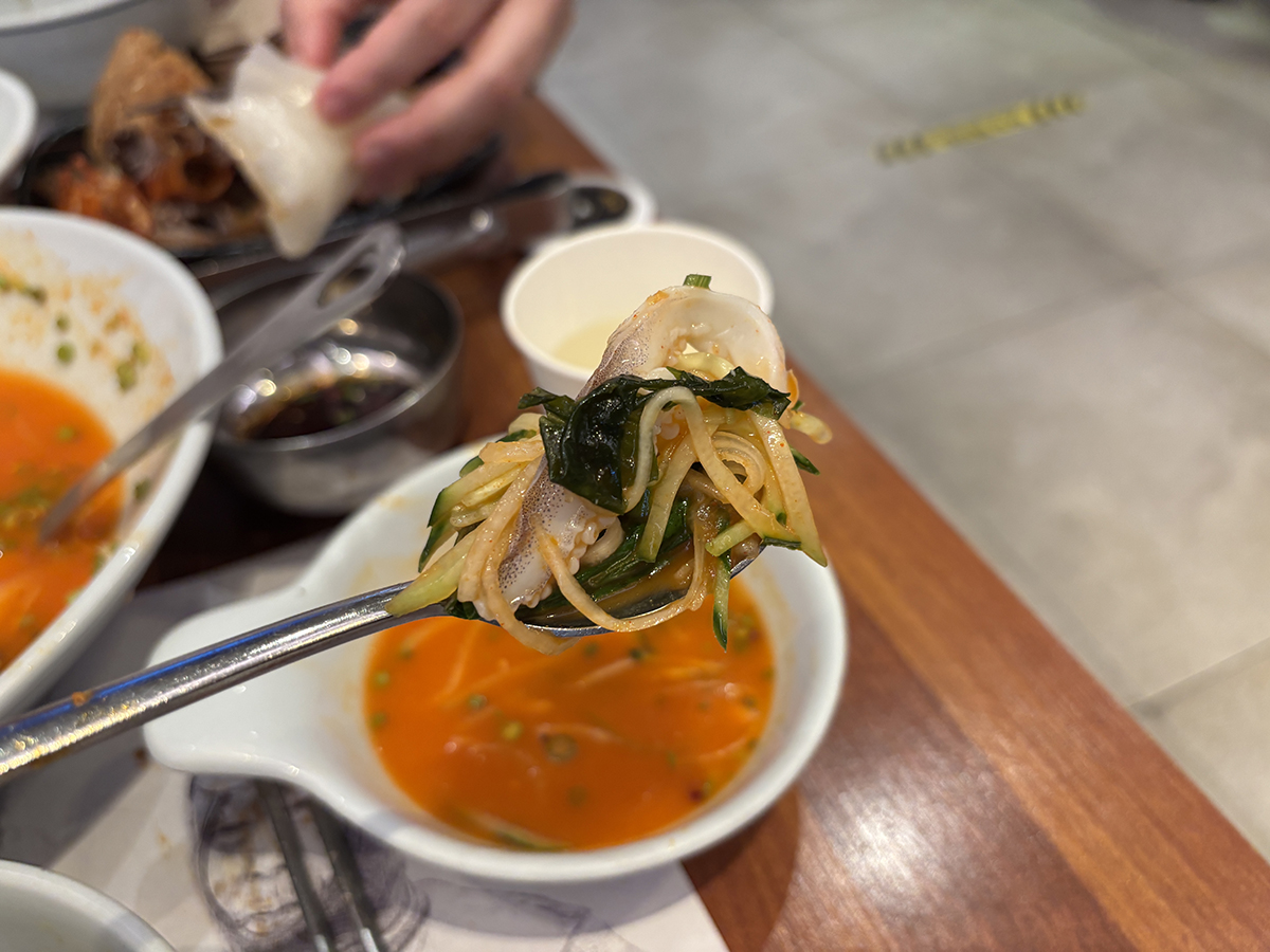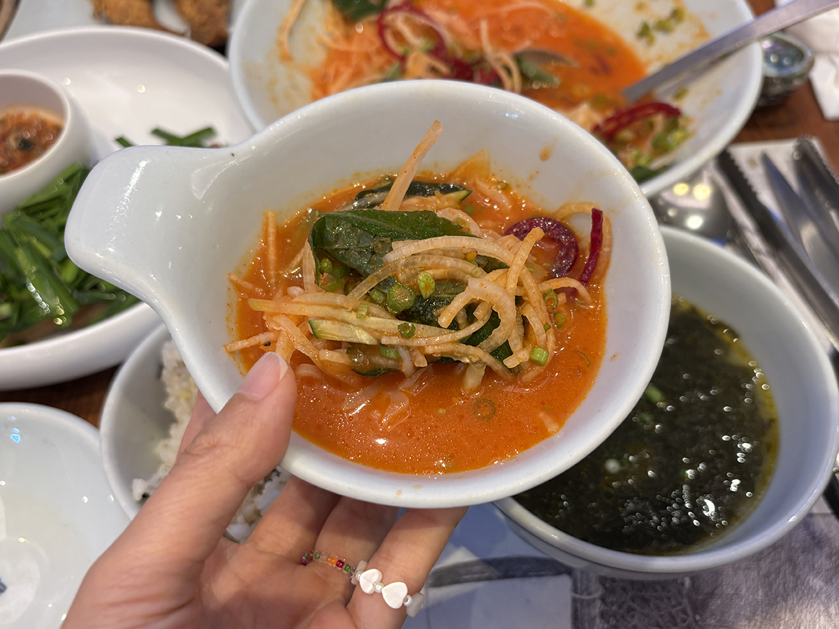 뿔소라미역국과 함께 나온 반찬은 잡채, 냉채, 우엉피클, 백김치, 미역무침
