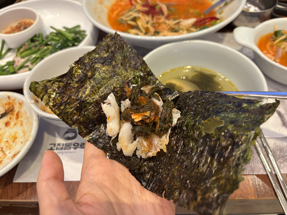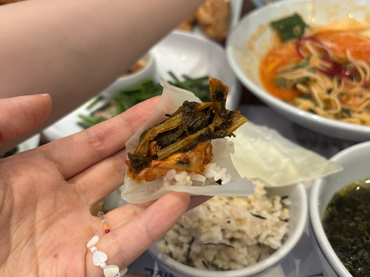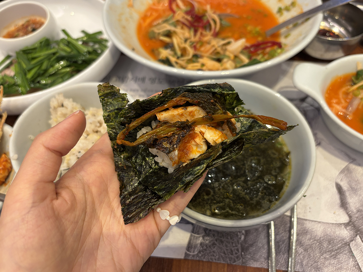낭푼밥에는 양배추, 채소 쌈과 구워진 김이 장들과 함께 나옴