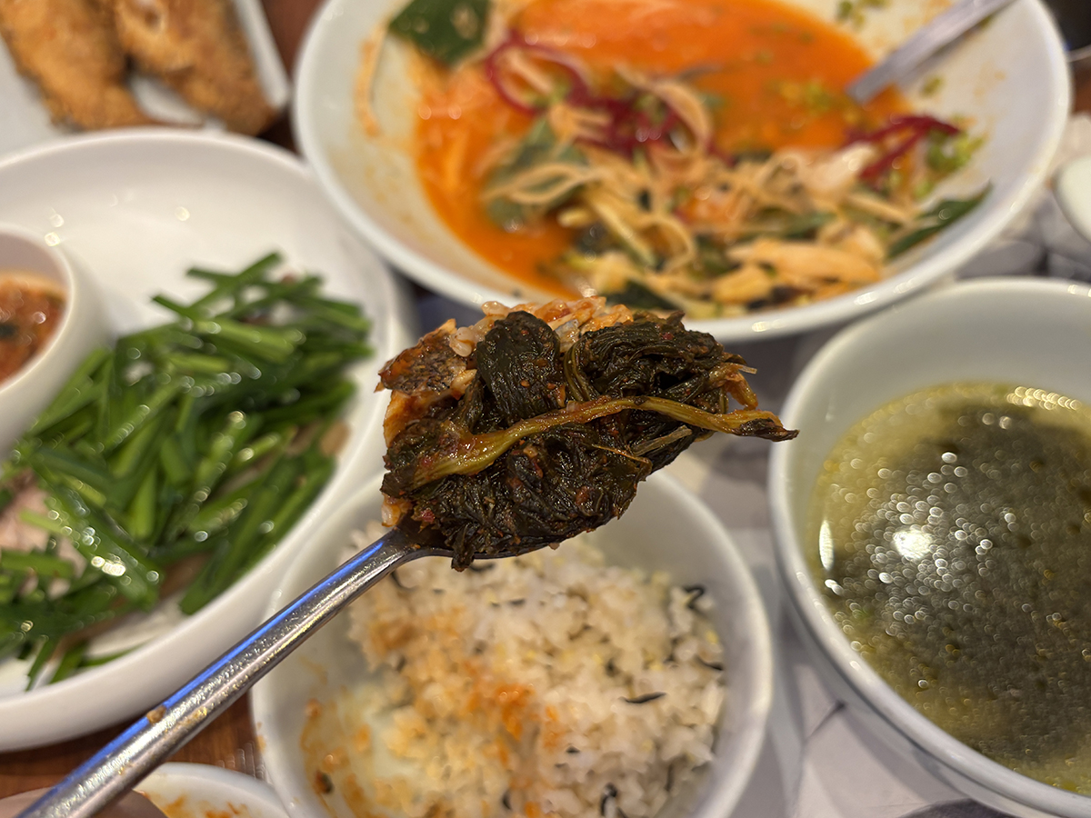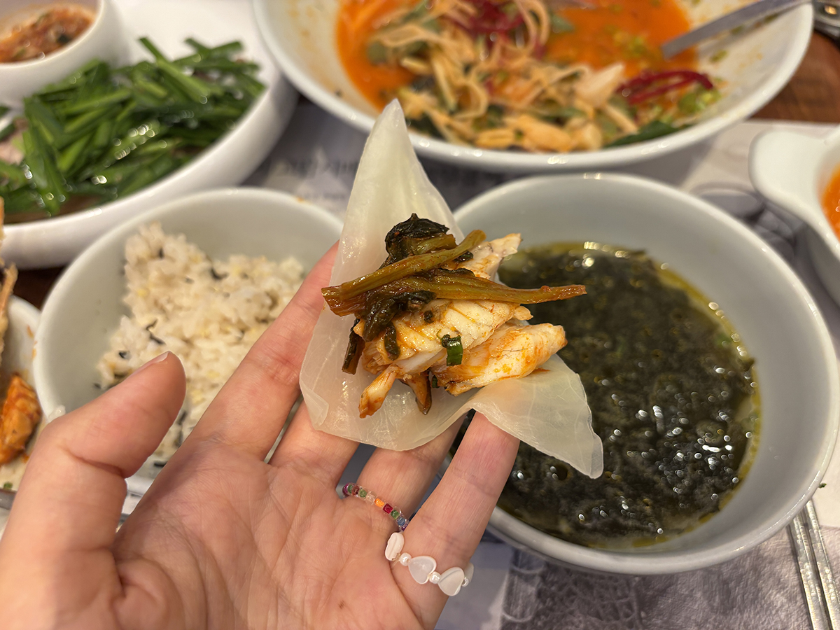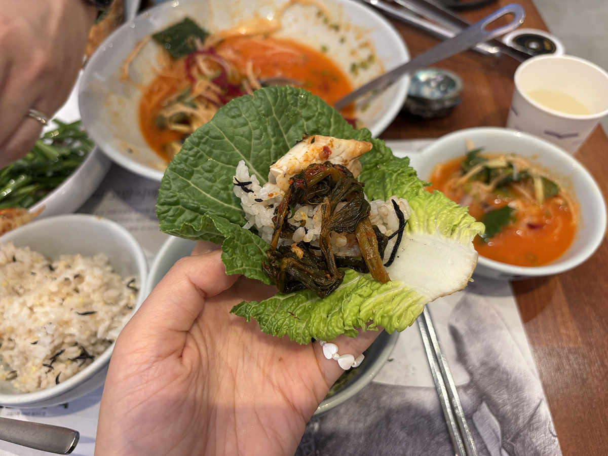 낭푼밥에는 양배추, 채소 쌈과 구워진 김이 장들과 함께 나옴