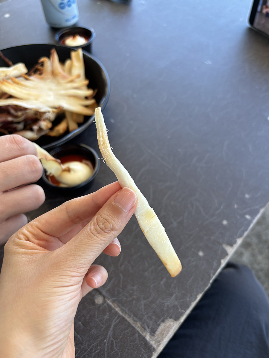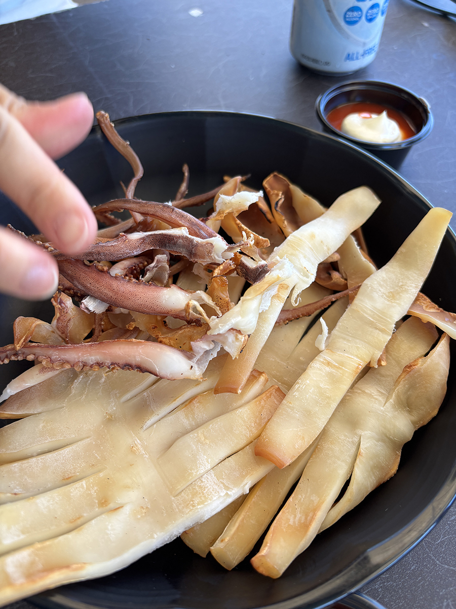 돌 위에서 구워지고 있는 반건조 오징어.. 맛있것다