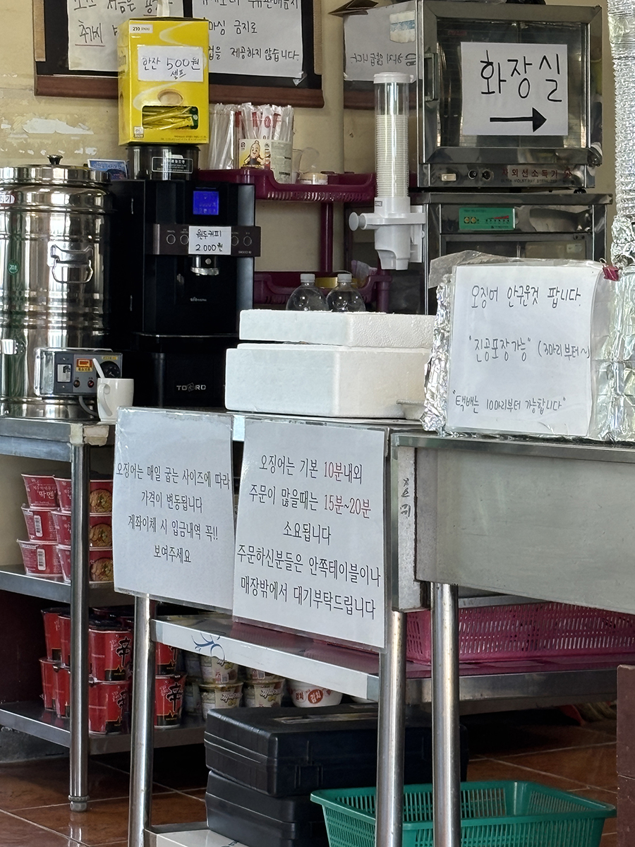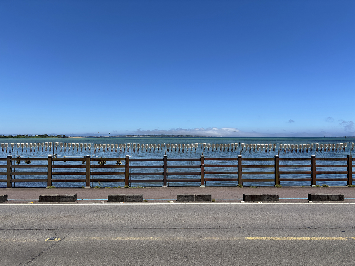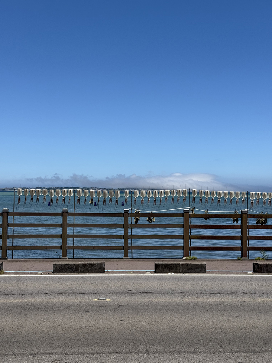 자리에 앉아서 보이는 뷰는 뜨거운 볕에 마르고 있는 오징어들