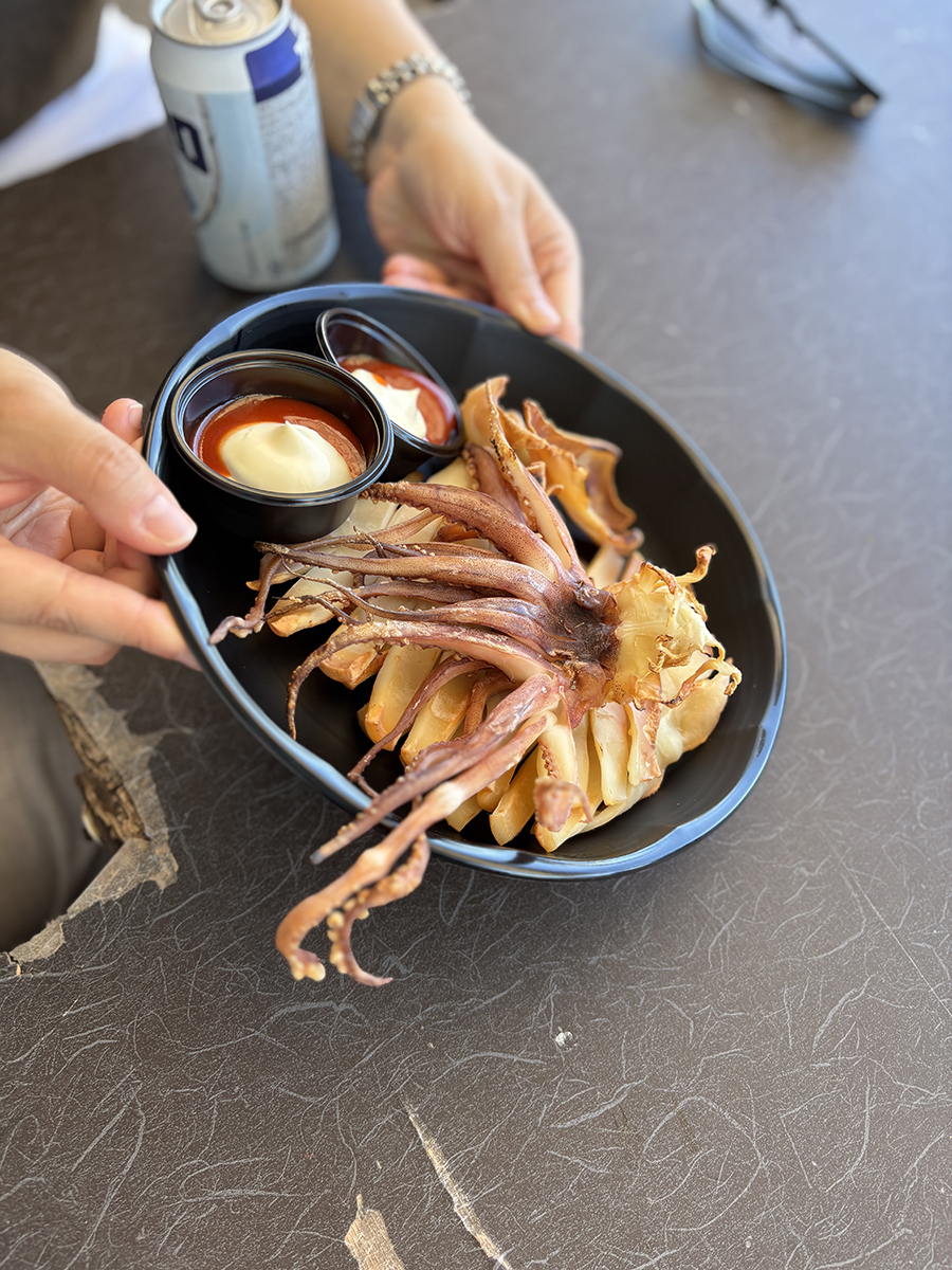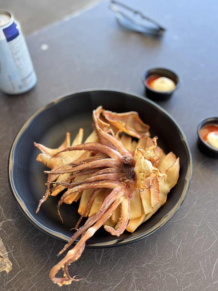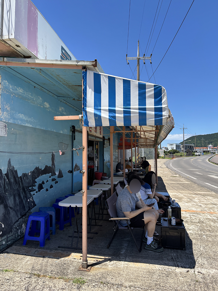 자리에 앉아서 보이는 뷰는 뜨거운 볕에 마르고 있는 오징어들