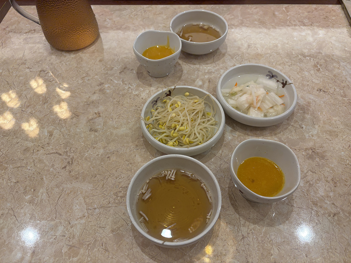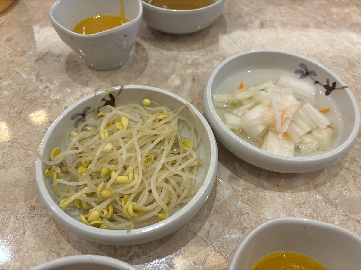 기본찬은 따뜻한 국물과 호박죽, 데친 콩나물, 백김치