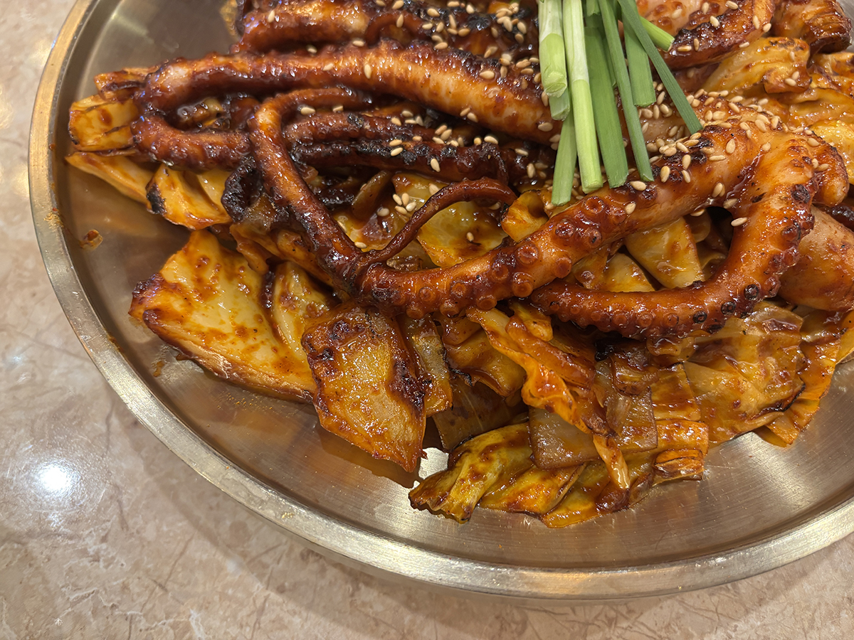 양배추와 통낙지가 빨간 양념에 볶아져 있고