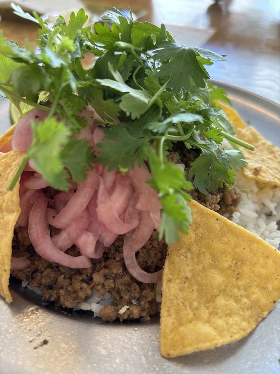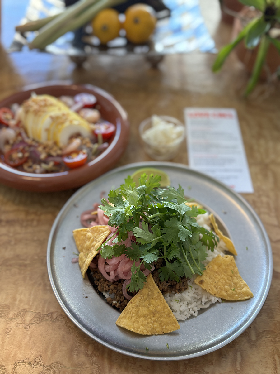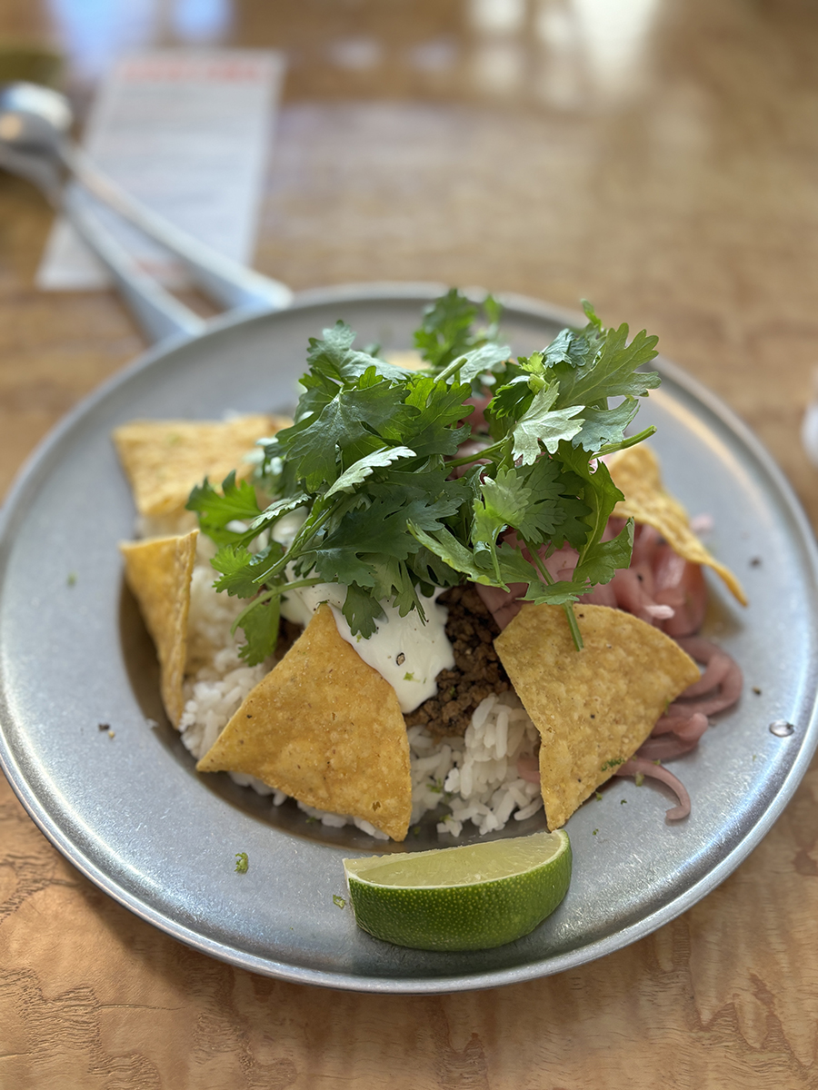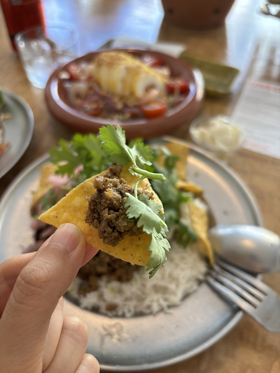 동남아식 쌀 위 볶아진 고기, 붉게 절인 양파, 하얀 소스, 노란 나초와