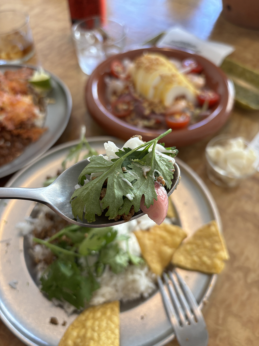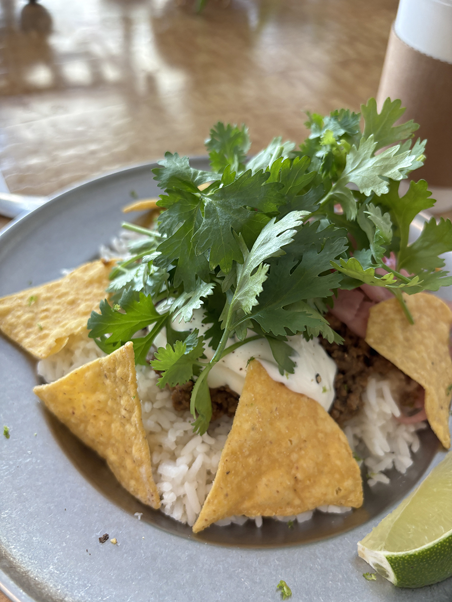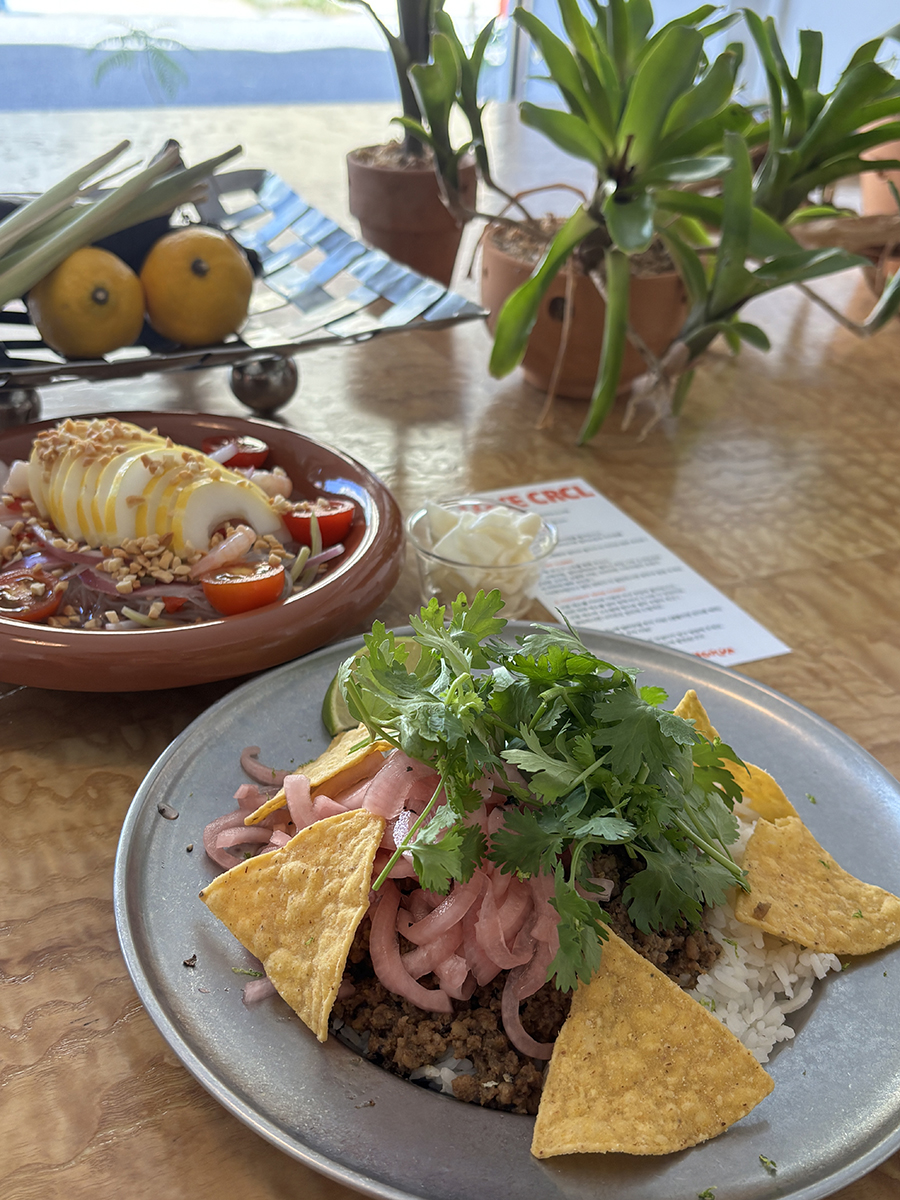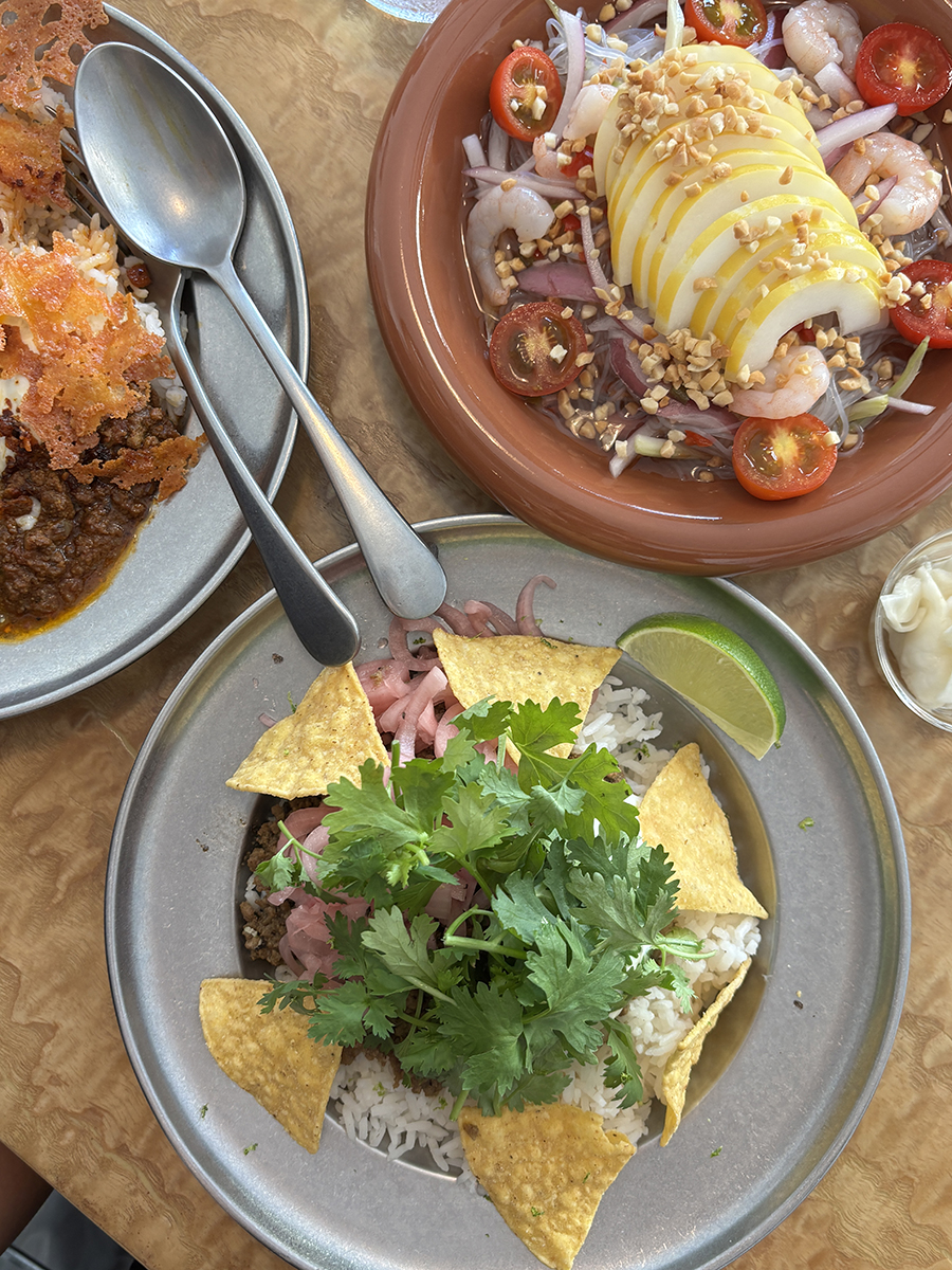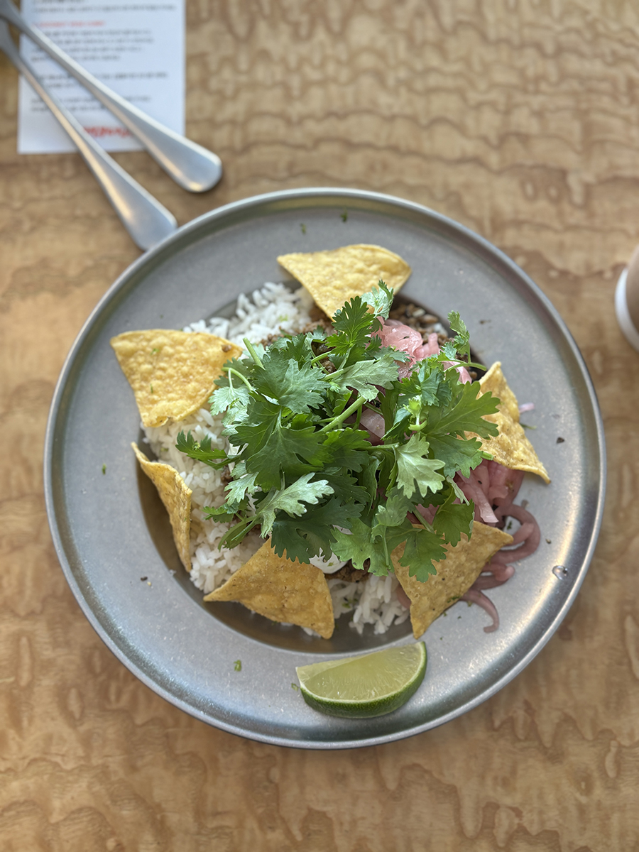 동남아식 쌀 위 볶아진 고기, 붉게 절인 양파, 하얀 소스, 노란 나초와