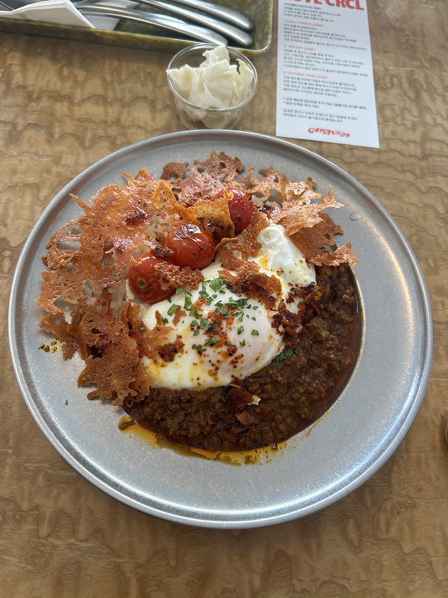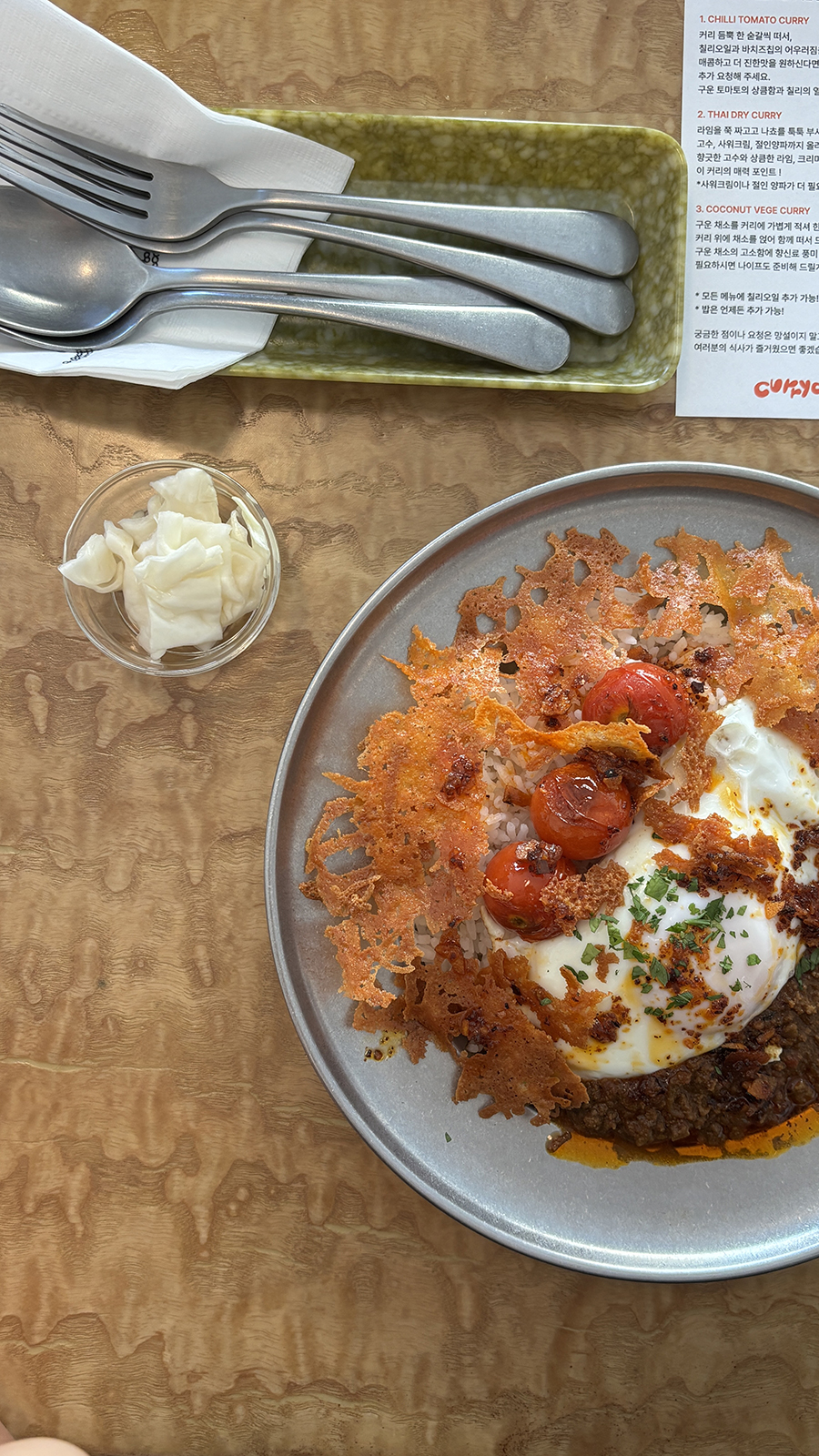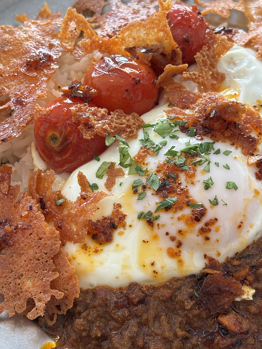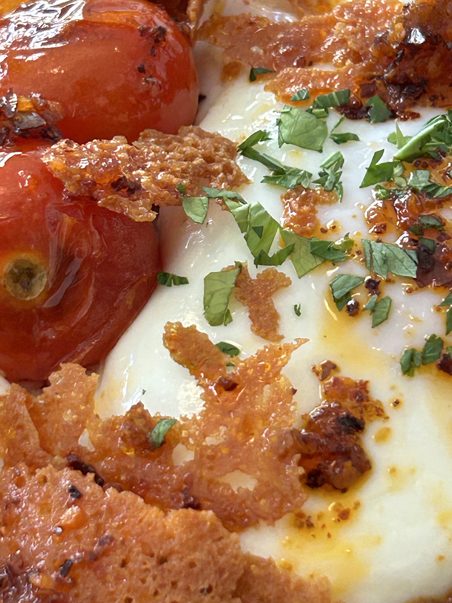 그 위로는 계란, 구운 방울토마토, 얇게 구워 바삭해진 치즈가 순서대로 올려져 있었다