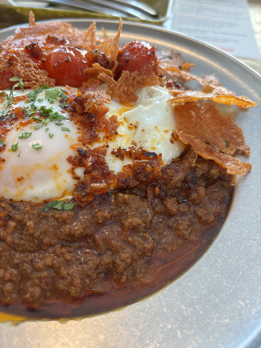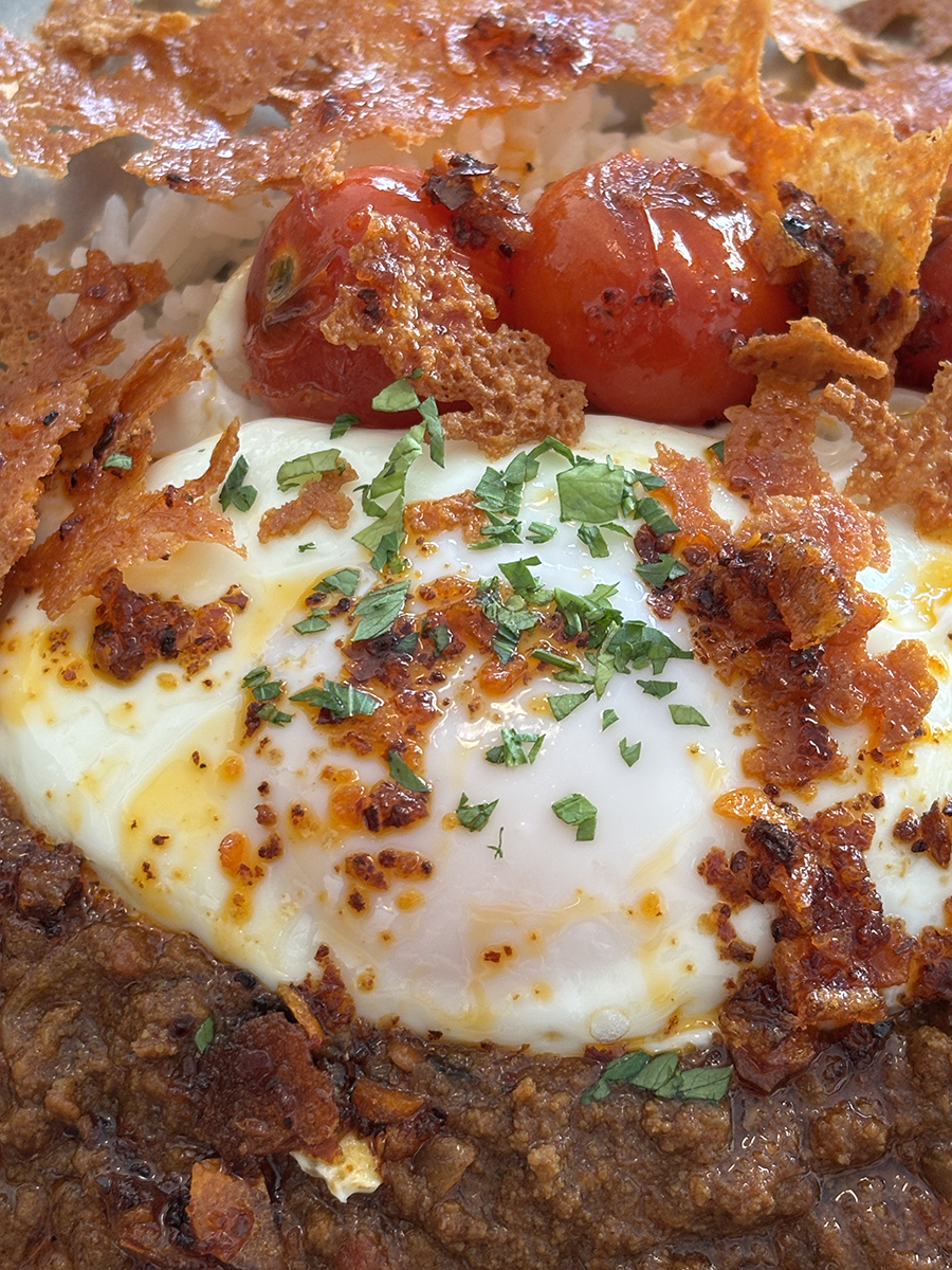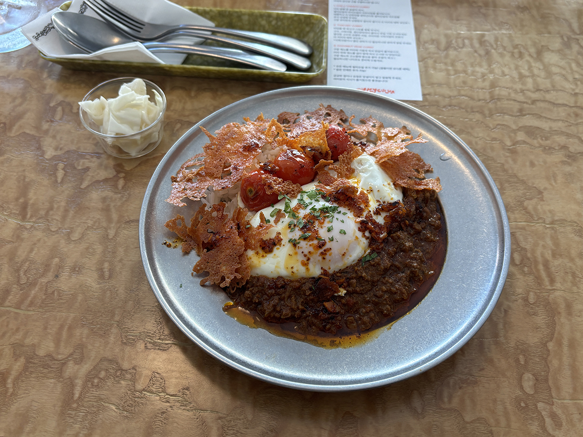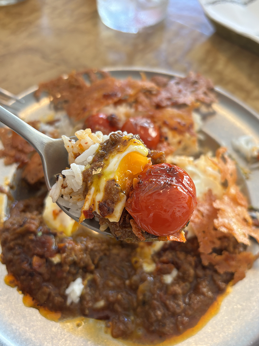 그 위로는 계란, 구운 방울토마토, 얇게 구워 바삭해진 치즈가 순서대로 올려져 있었다
