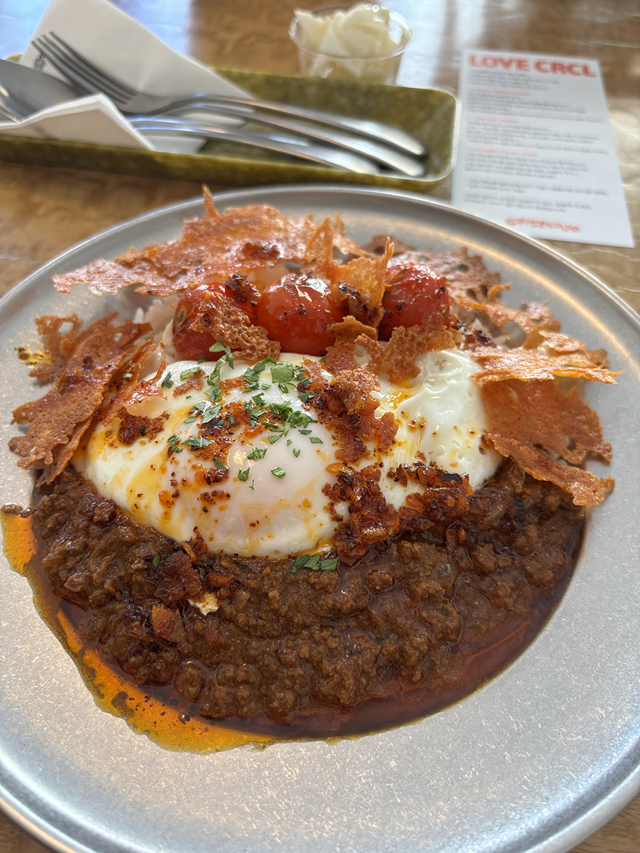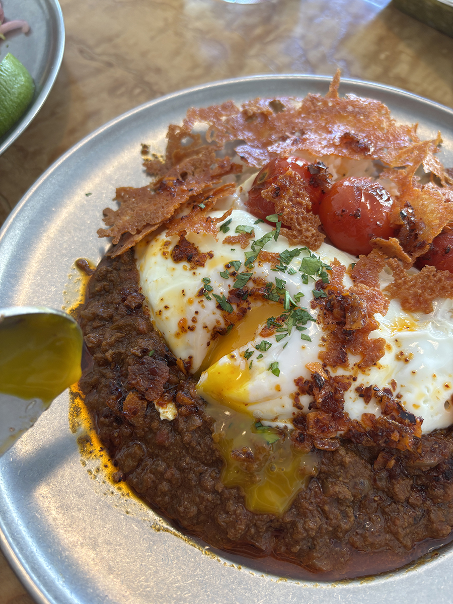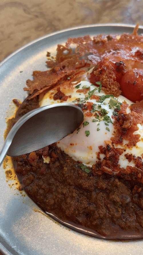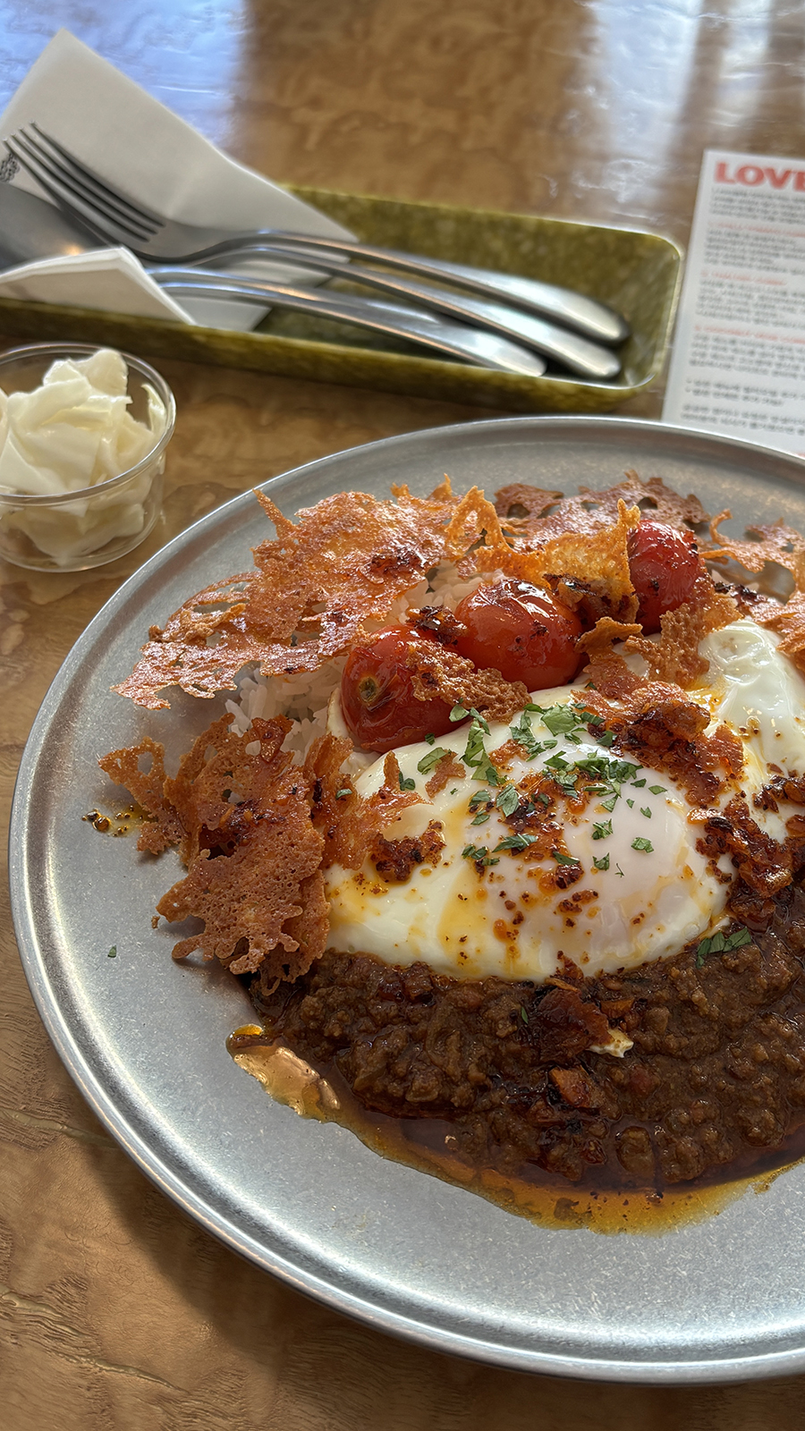 그 위로는 계란, 구운 방울토마토, 얇게 구워 바삭해진 치즈가 순서대로 올려져 있었다