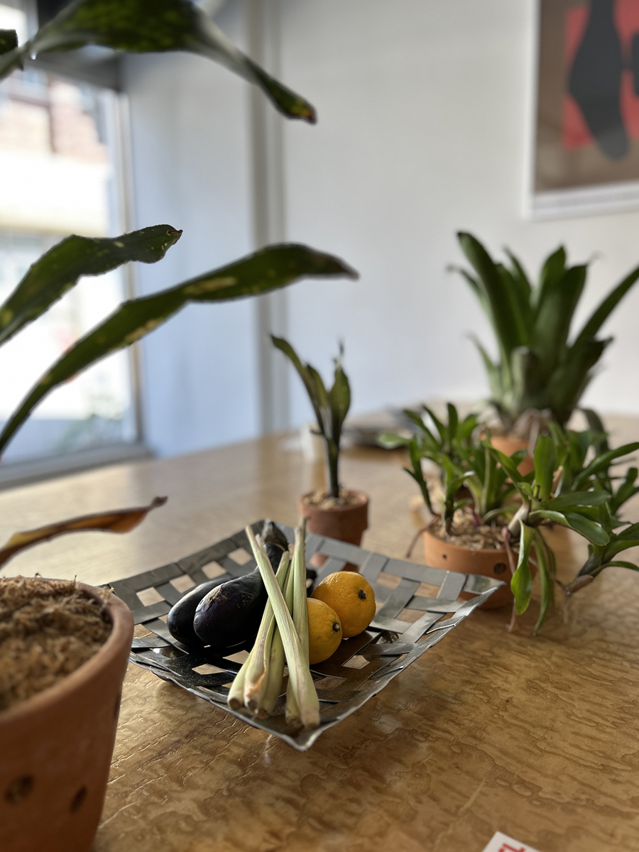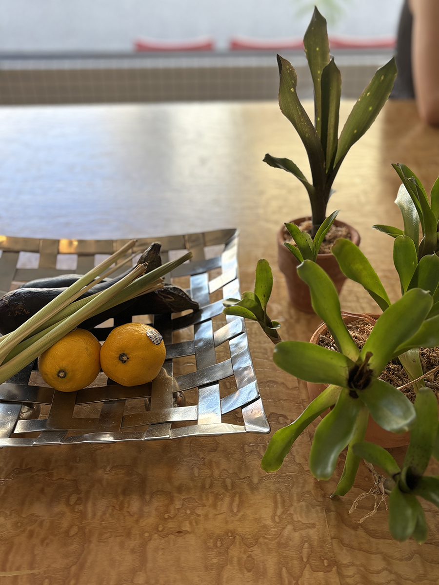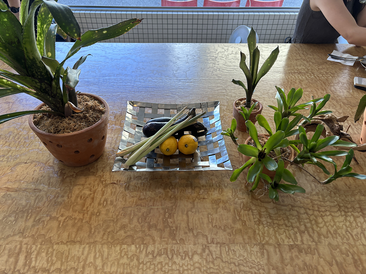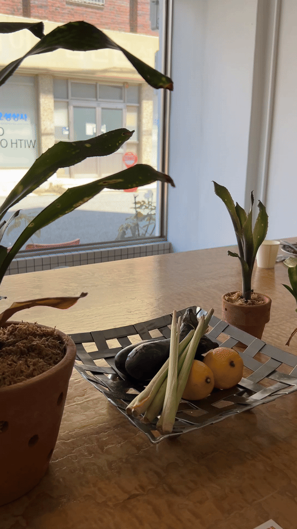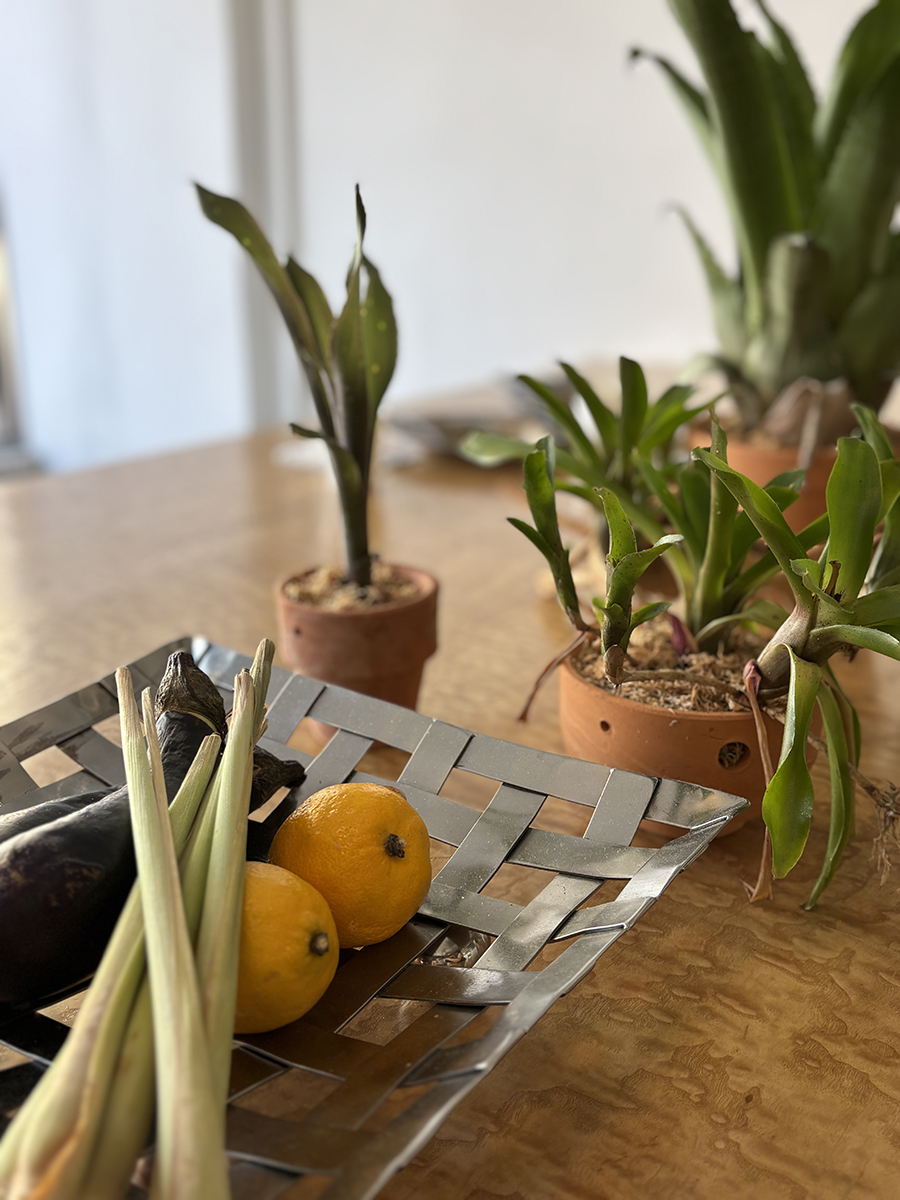 테이블 위에 화분에 담긴 풀들과 함께 채소와 레몬이 올려져 있었는데