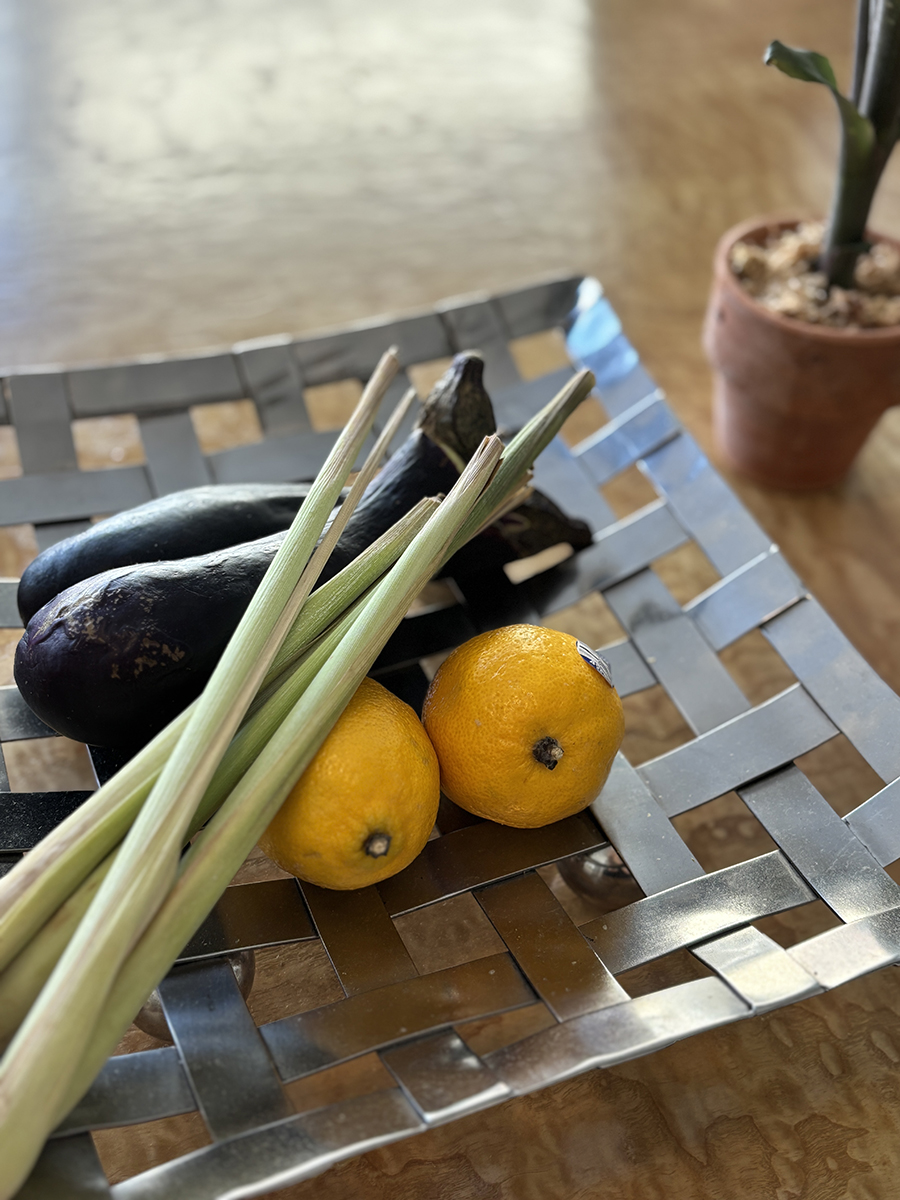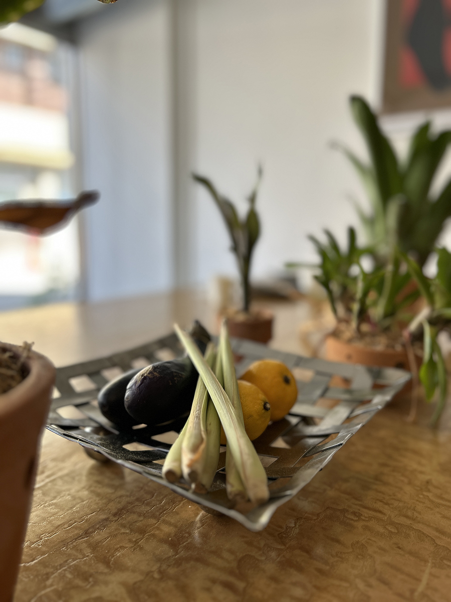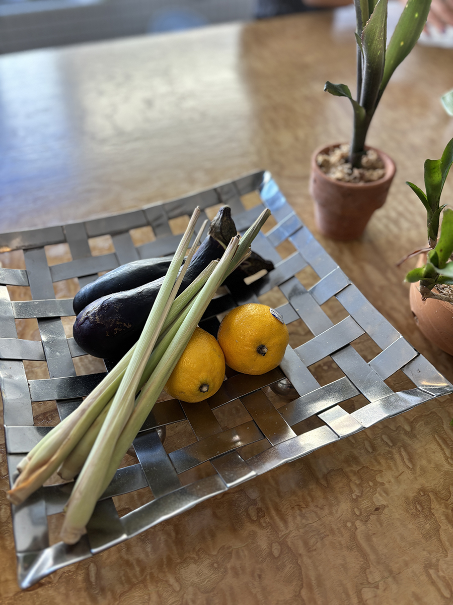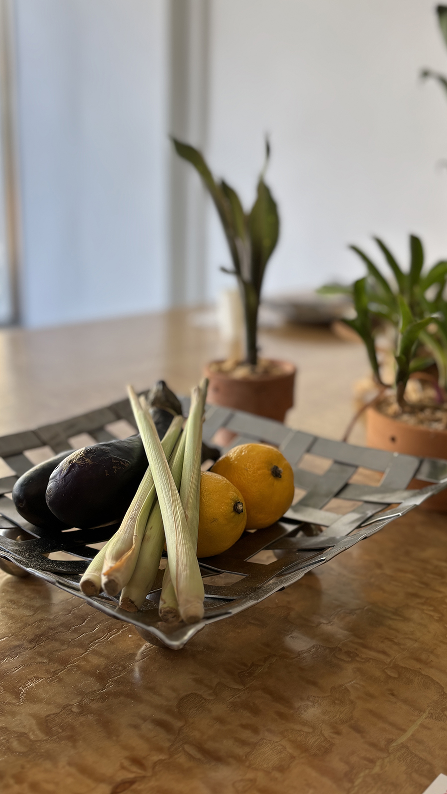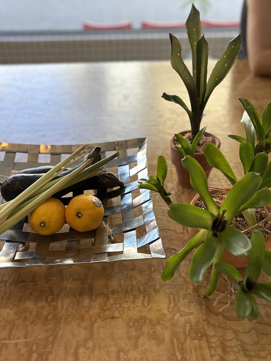 테이블 위에 화분에 담긴 풀들과 함께 채소와 레몬이 올려져 있었는데