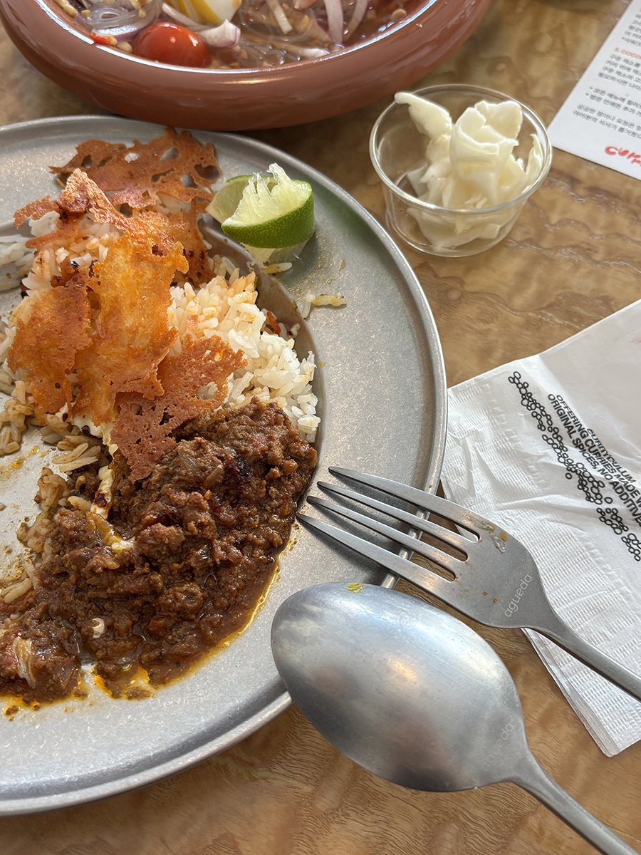 토마토, 칠리에 조린 매콤한 고기 카레가 동남아식 쌀 위에 깔리고