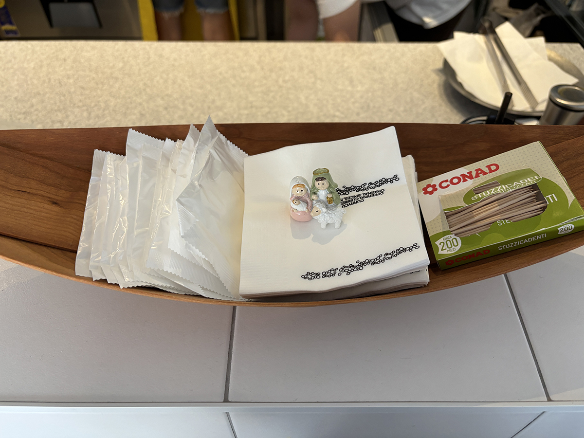 주문한 음료가 커트러리, 티슈, 소개 안내지와 함께