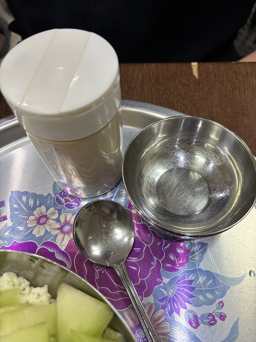 꽃무늬가 있는 은색 쟁반 위에 빙수와 숟가락, 앞접시