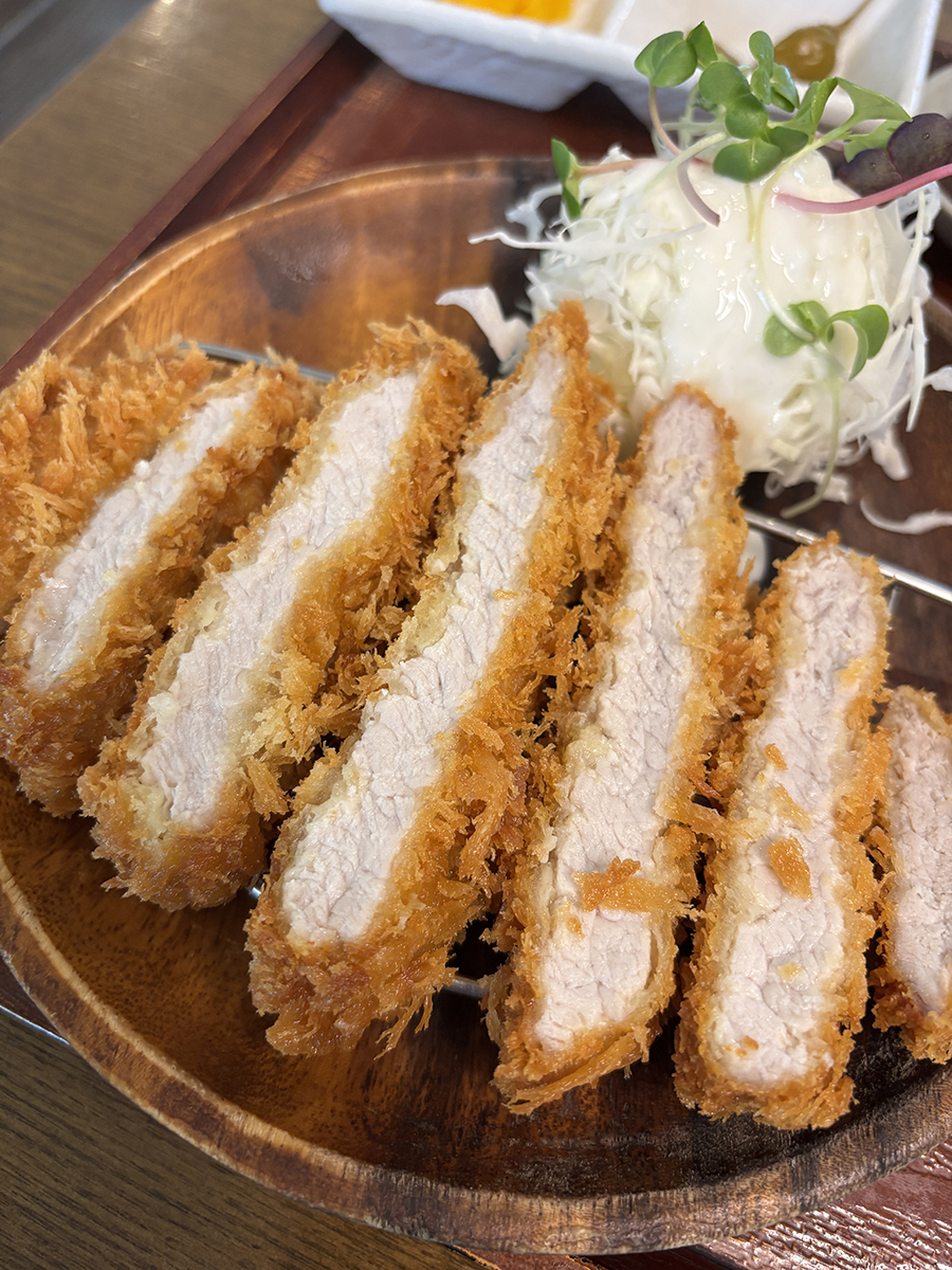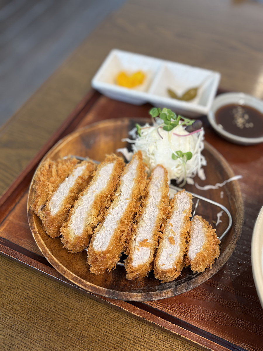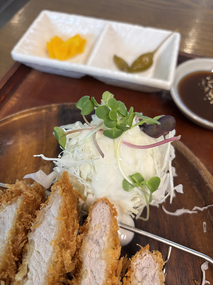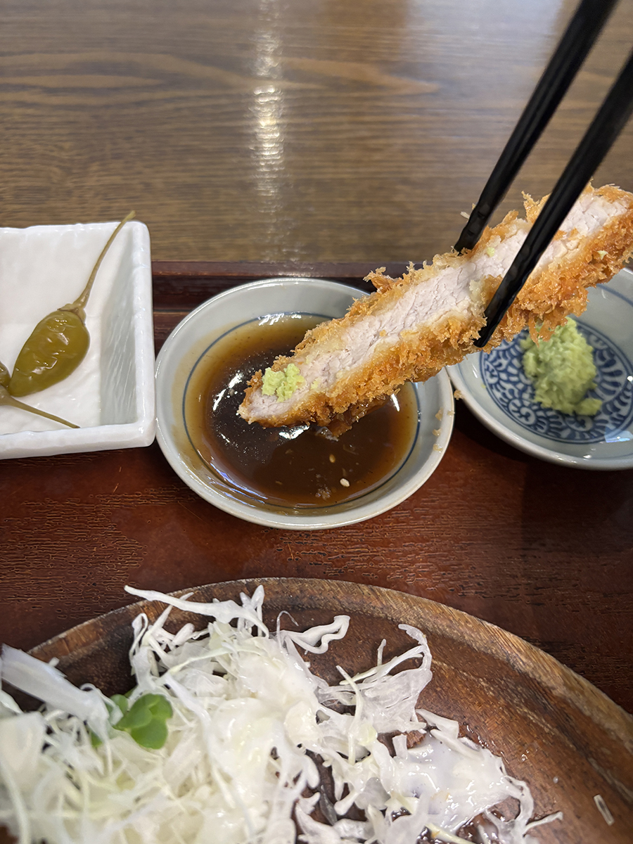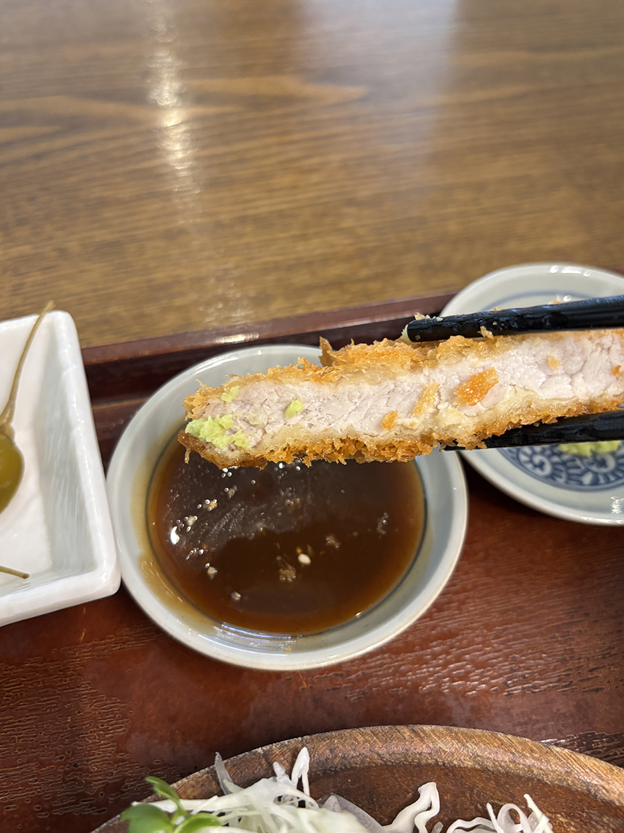 돈가스에는 양배추 샐러드도 같이 있음! 두툼한 돈가스 위에 와사비를 올리고