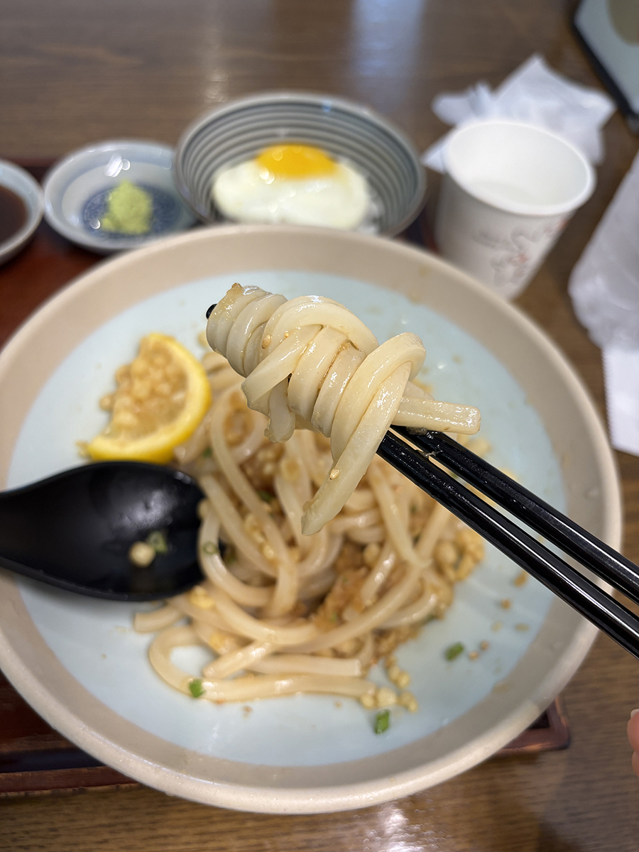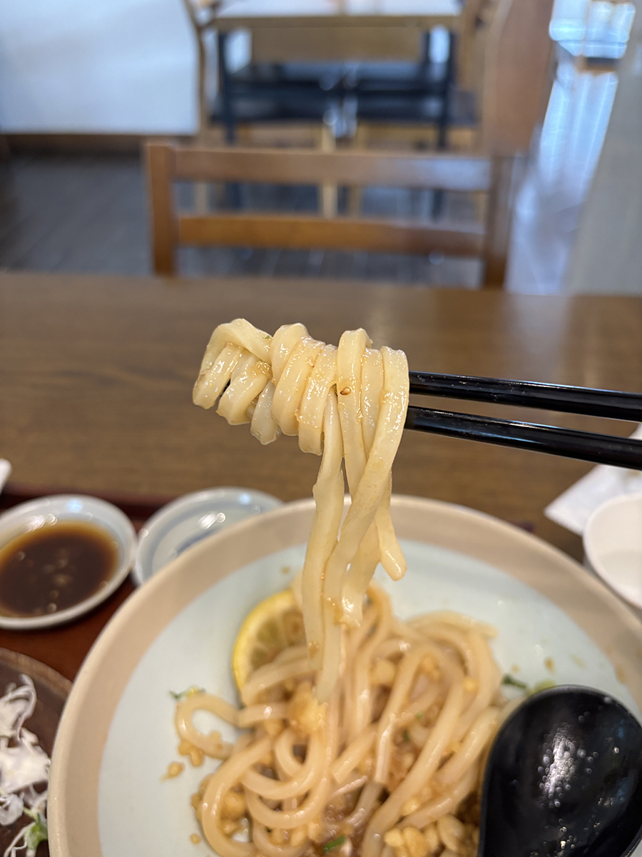 잘 비빈 우동도 단단하고 쫄깃해 맛있고요~