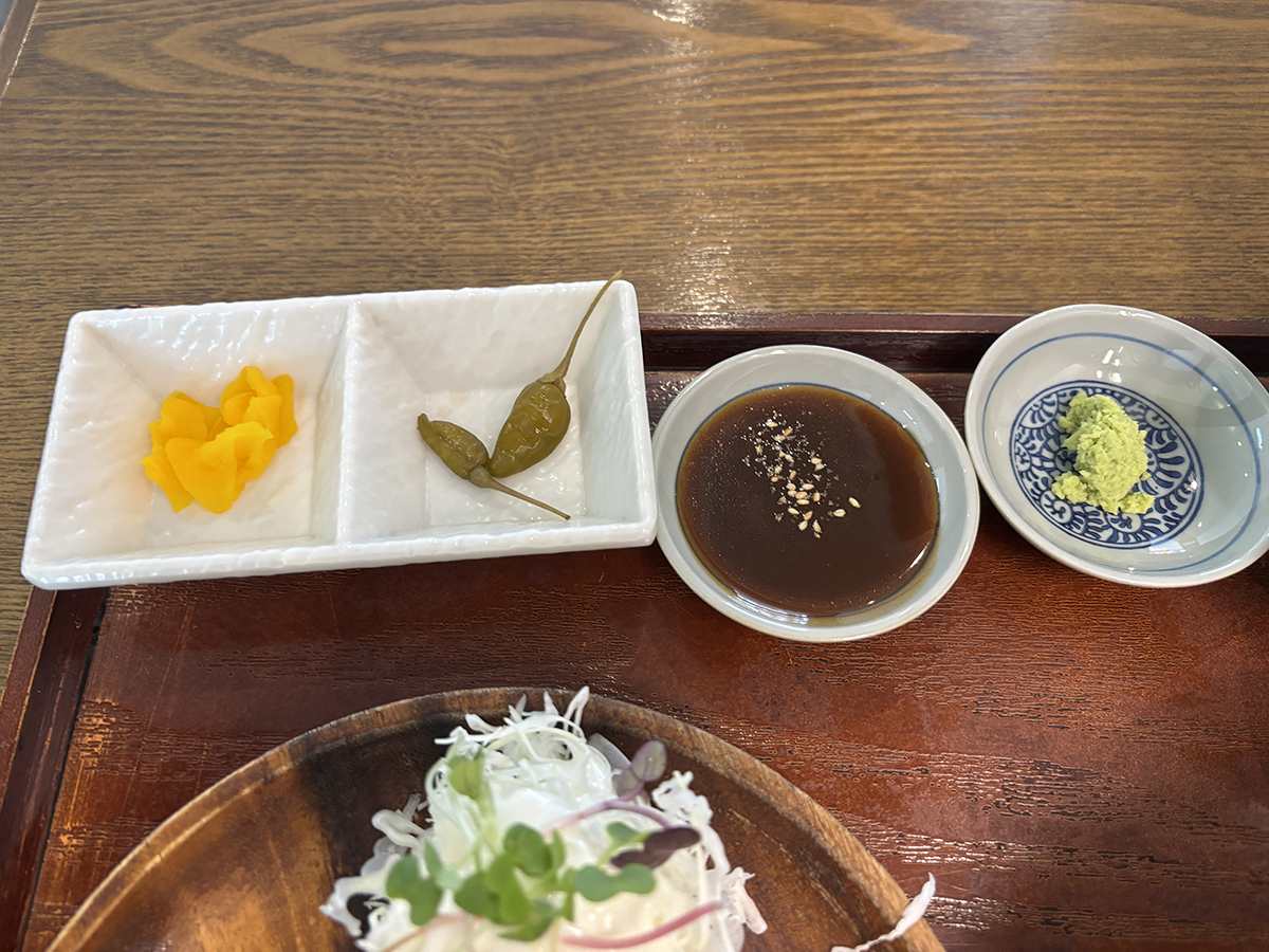 반찬으로는 단무지, 할라피뇨, 돈가스 소스, 와사비, 계란 후라이가 올려진 밥이 나온다