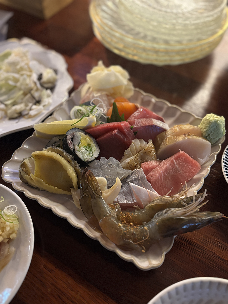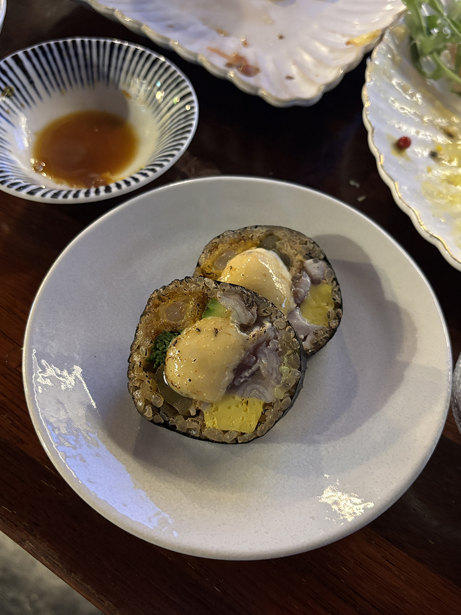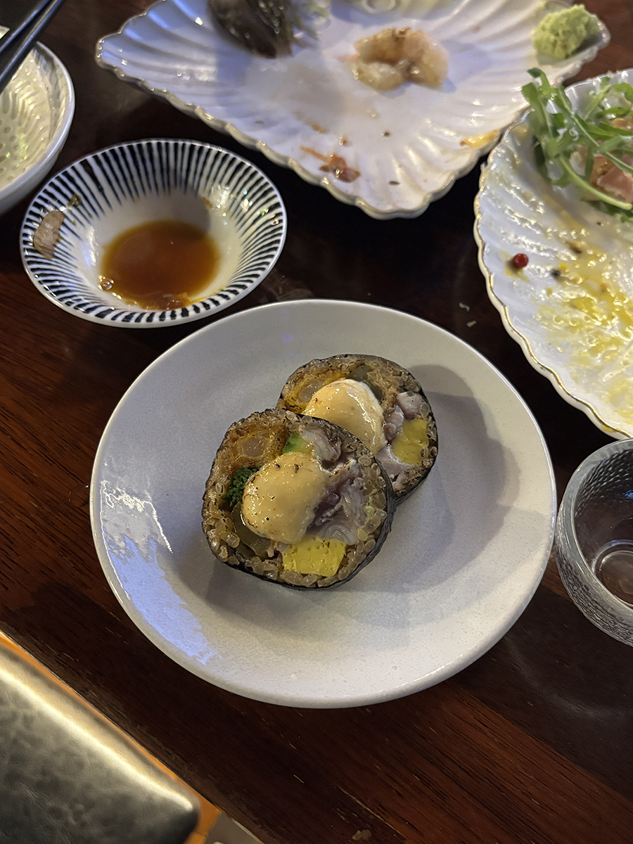 토치로 그을린 김초밥 서비스로 한 점씩 나왔음