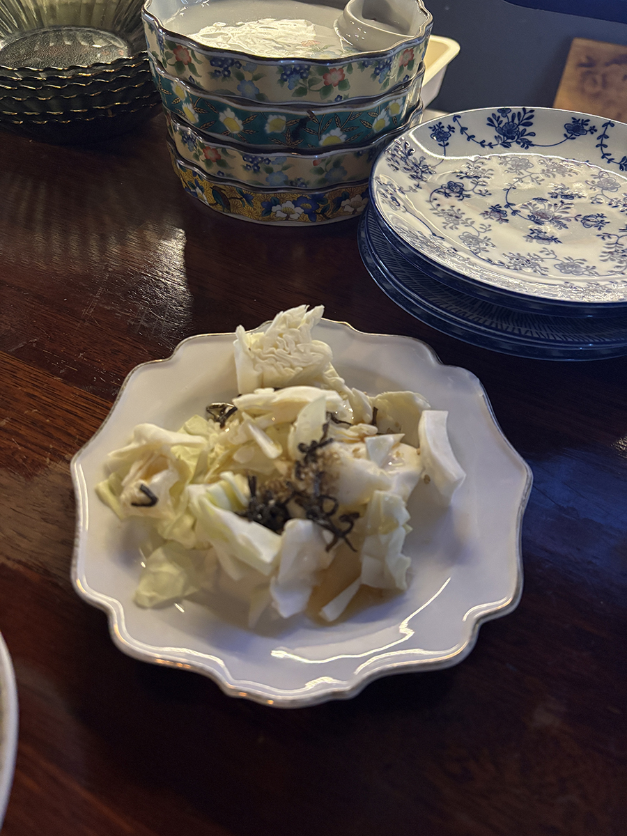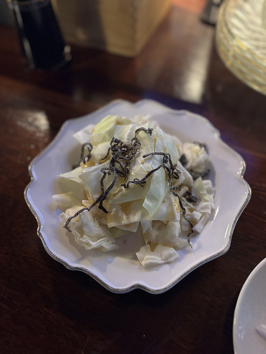 자리에 앉으면 기본찬으로 소스 올린 양배추를 준다