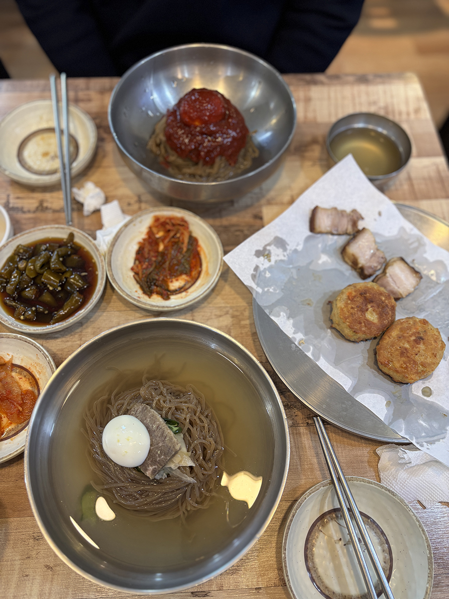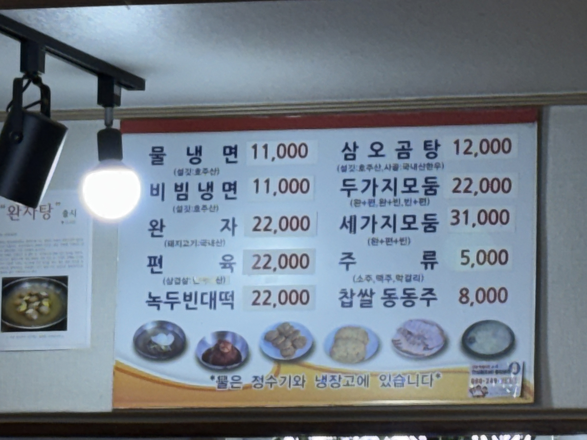 우리는 완자 편육 반반 있는 한판하고 물냉면 비빔냉면 하나씩을 주문