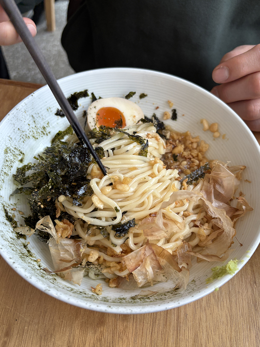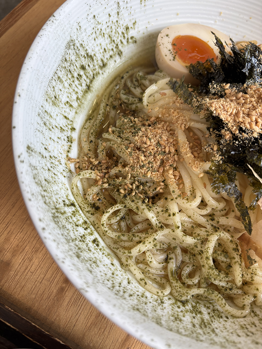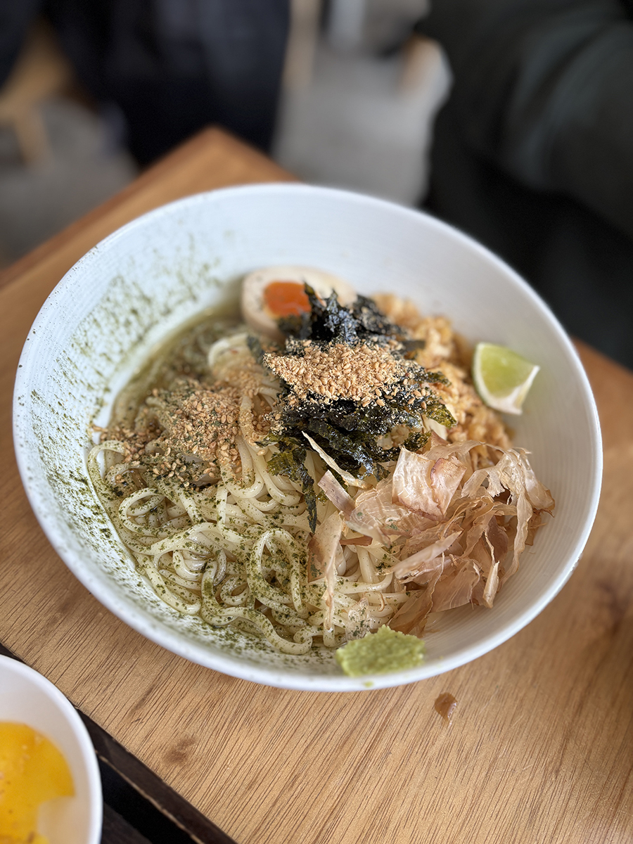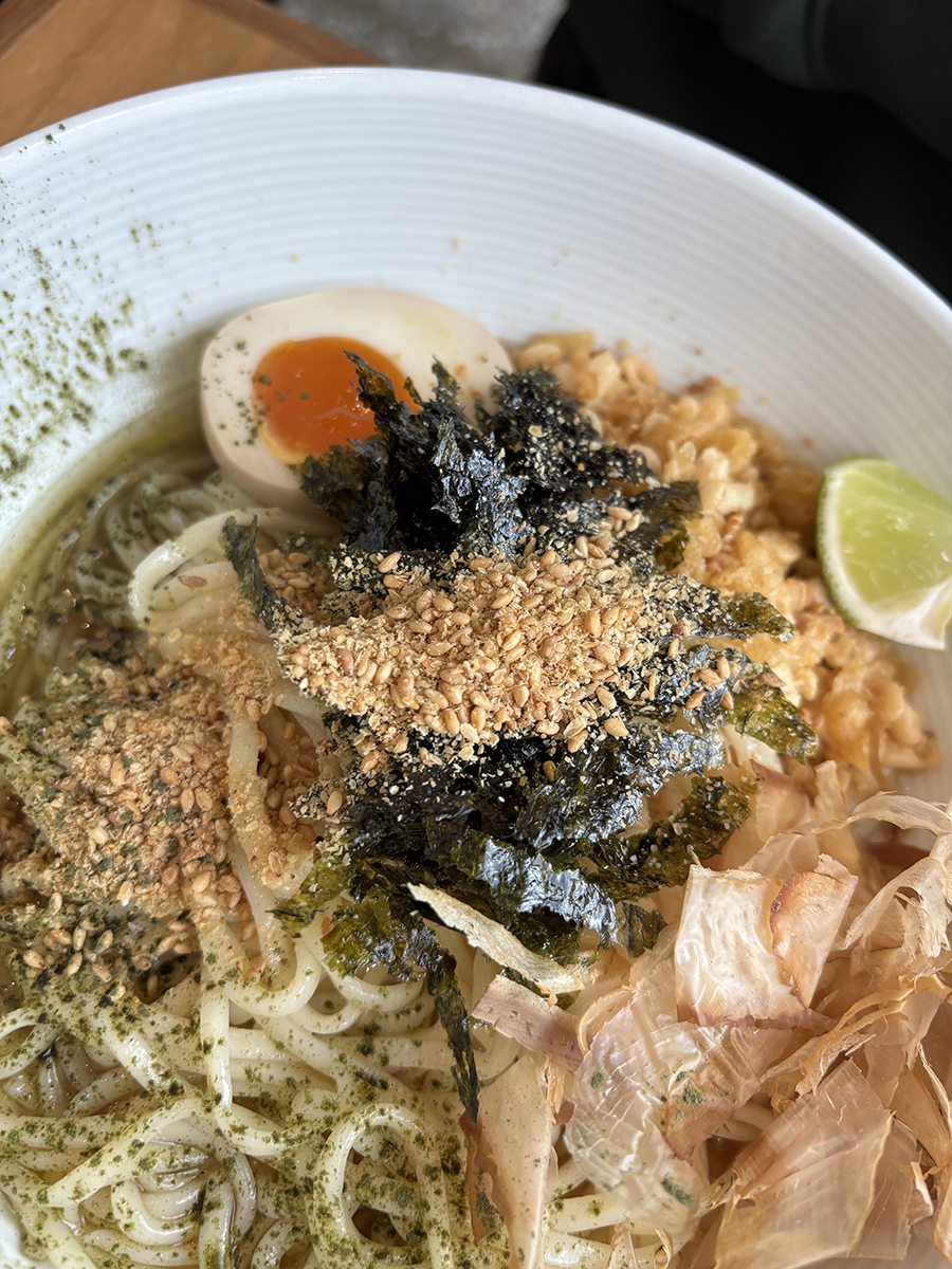 면과 소스 위에 가쓰오부시, 튀김가루, 반숙, 라임조각, 깨, 김가루, 파래가루가 뿌려져 있음