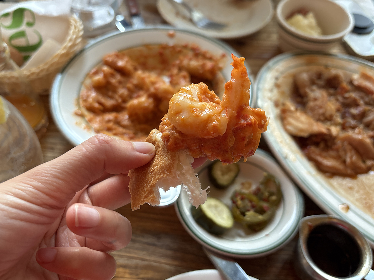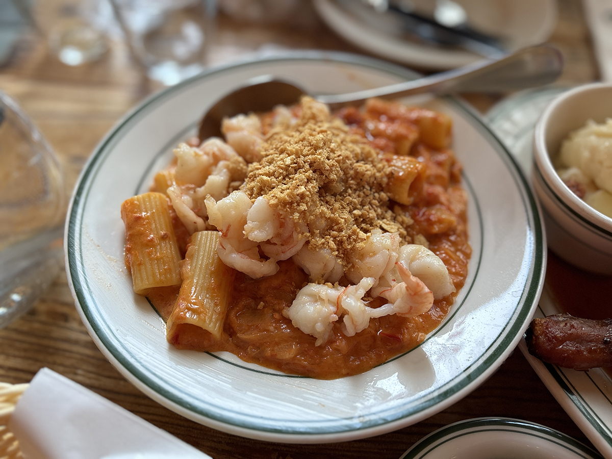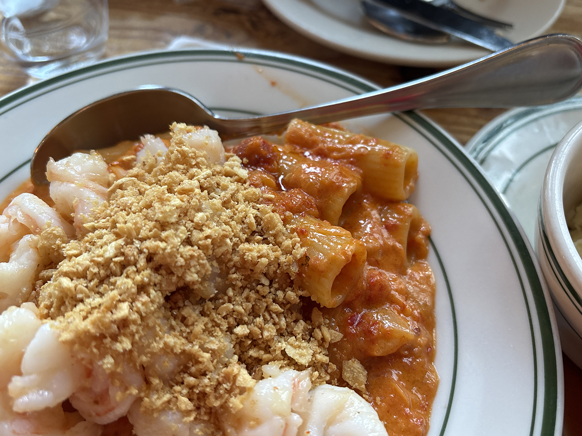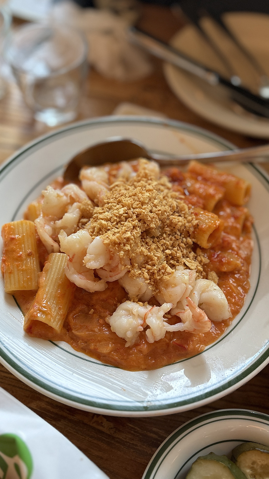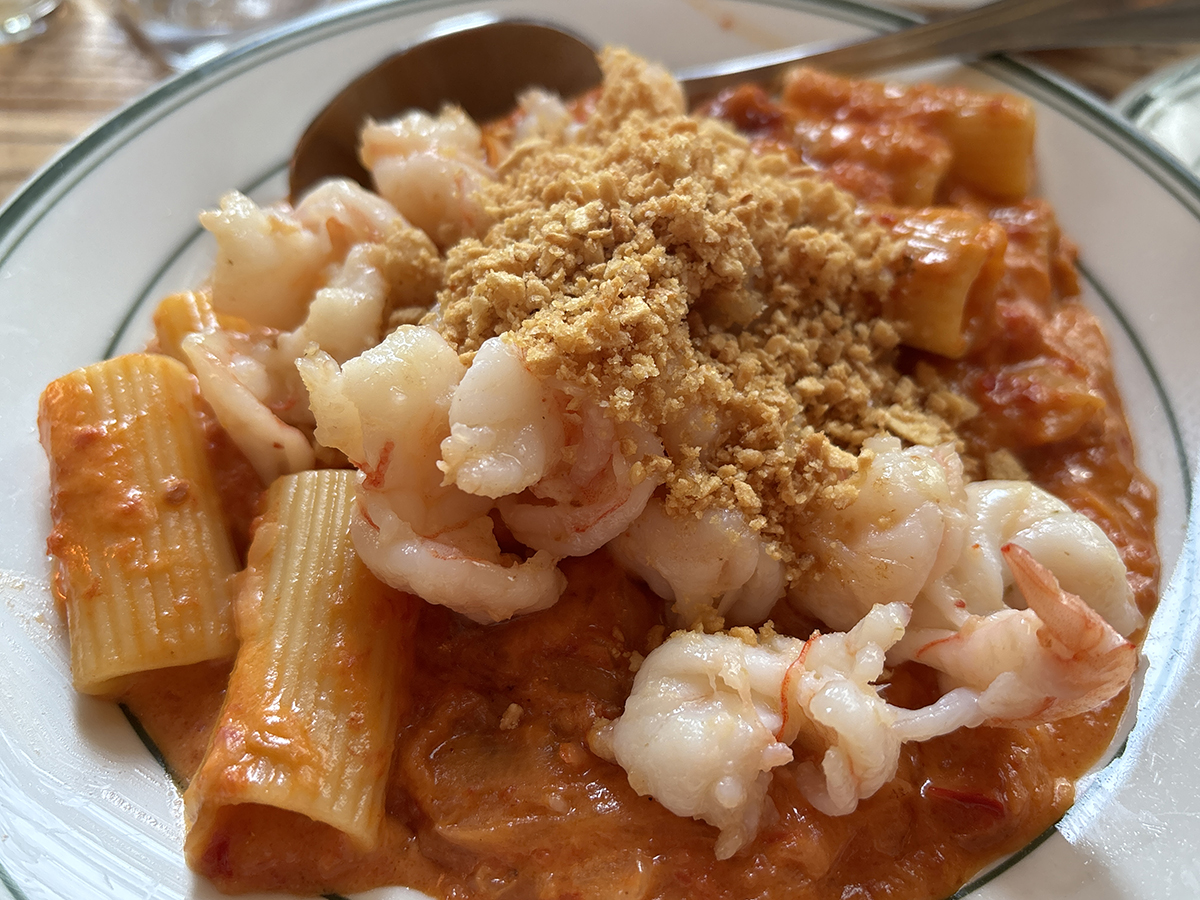 그릴 갈릭 버터 새우와 오동통 새우가 올려진 마카로니 파스타