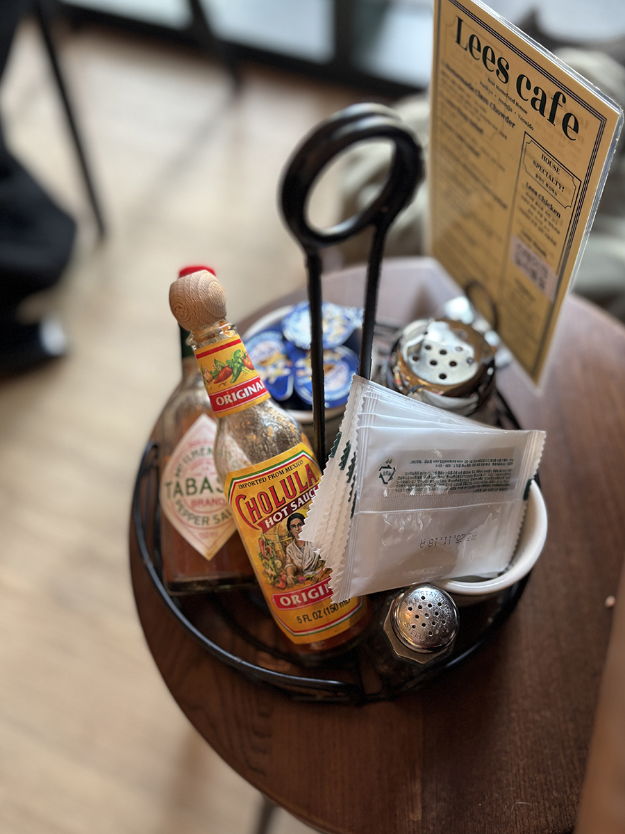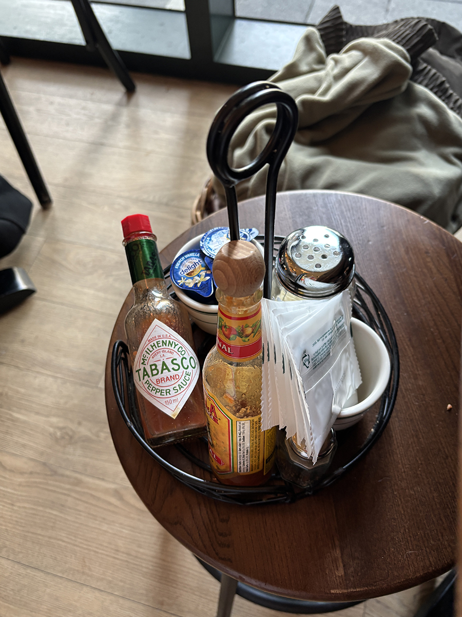 옆 작은 의자 위에는 타바스코, 핫소스, 후추, 소금, 물티슈 등이 준비되어 있었다