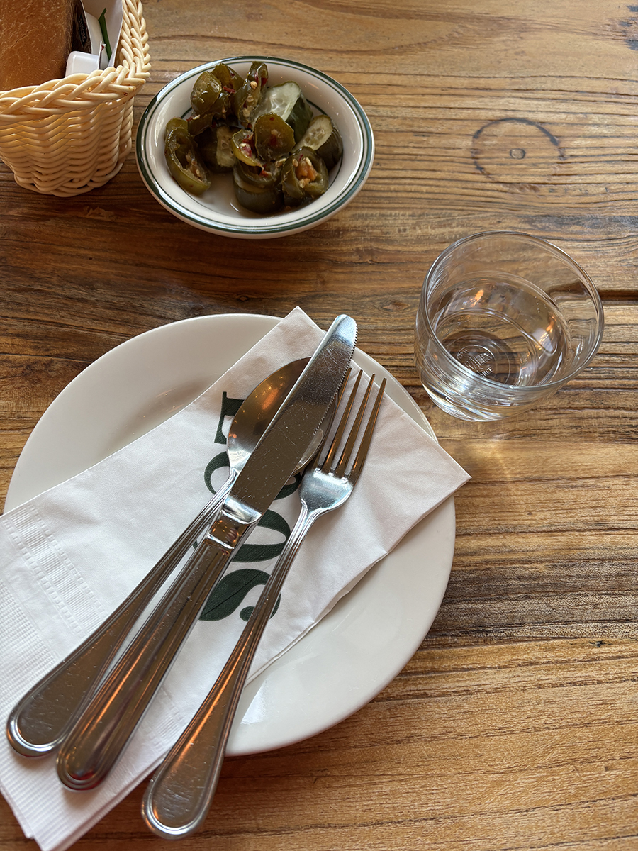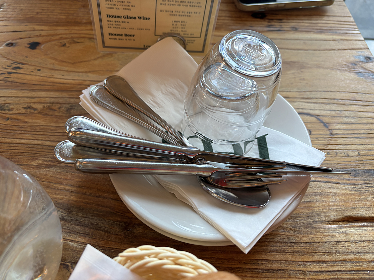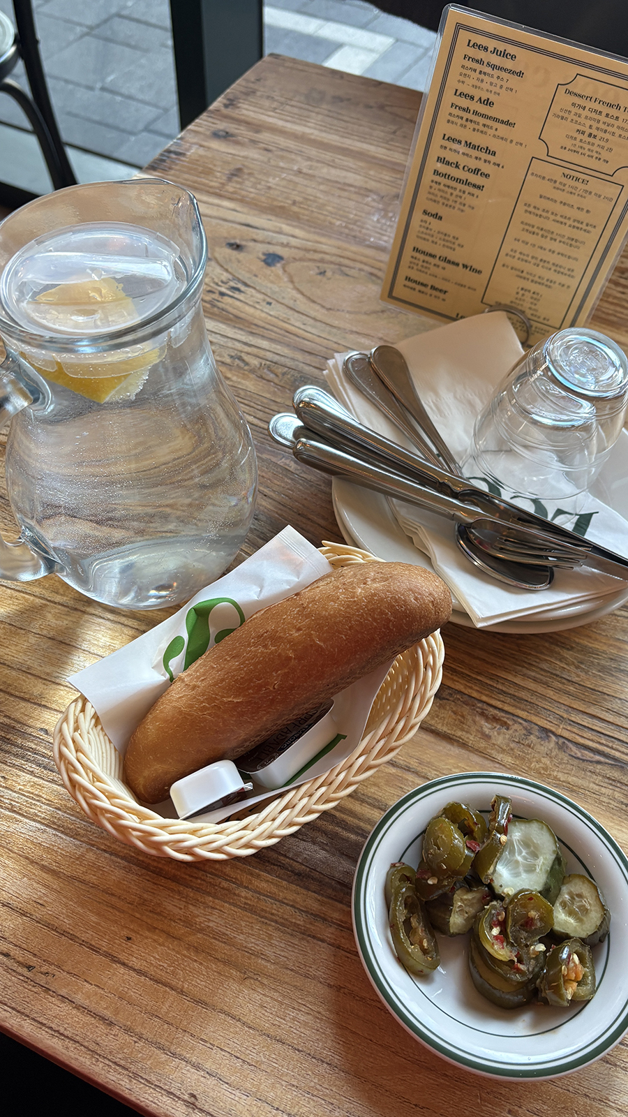 메뉴판과 함께 물, 앞접시, 컵, 티슈, 커트러리, 빵과 버터, 피클이 있었고