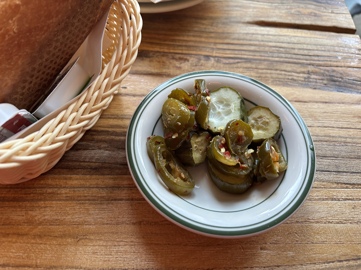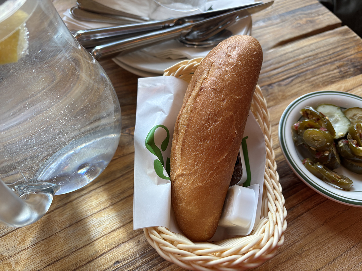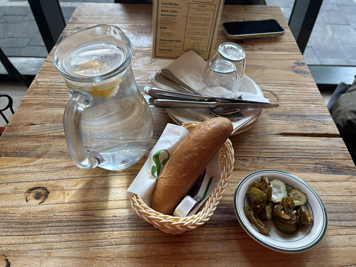 메뉴판과 함께 물, 앞접시, 컵, 티슈, 커트러리, 빵과 버터, 피클이 있었고