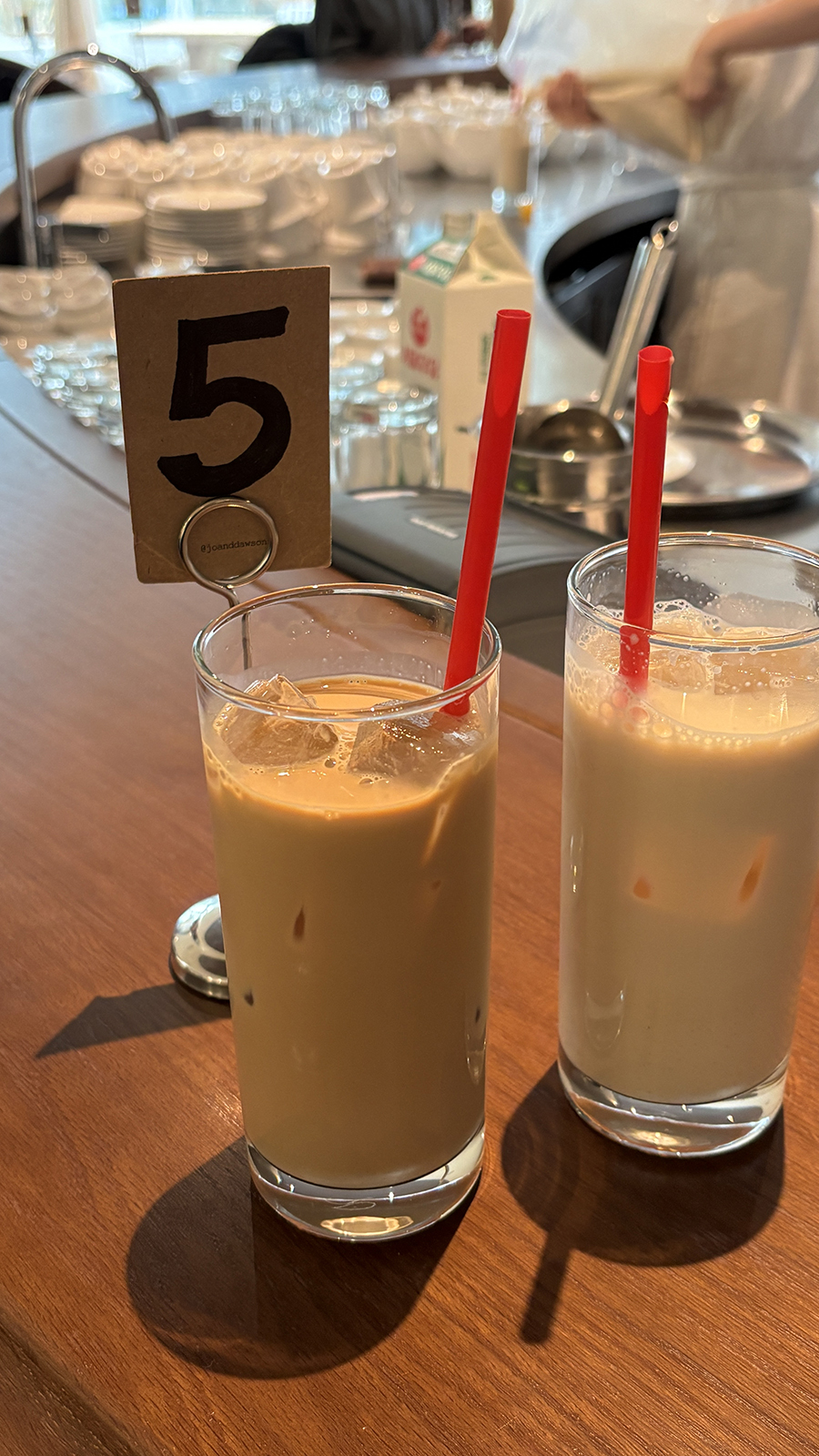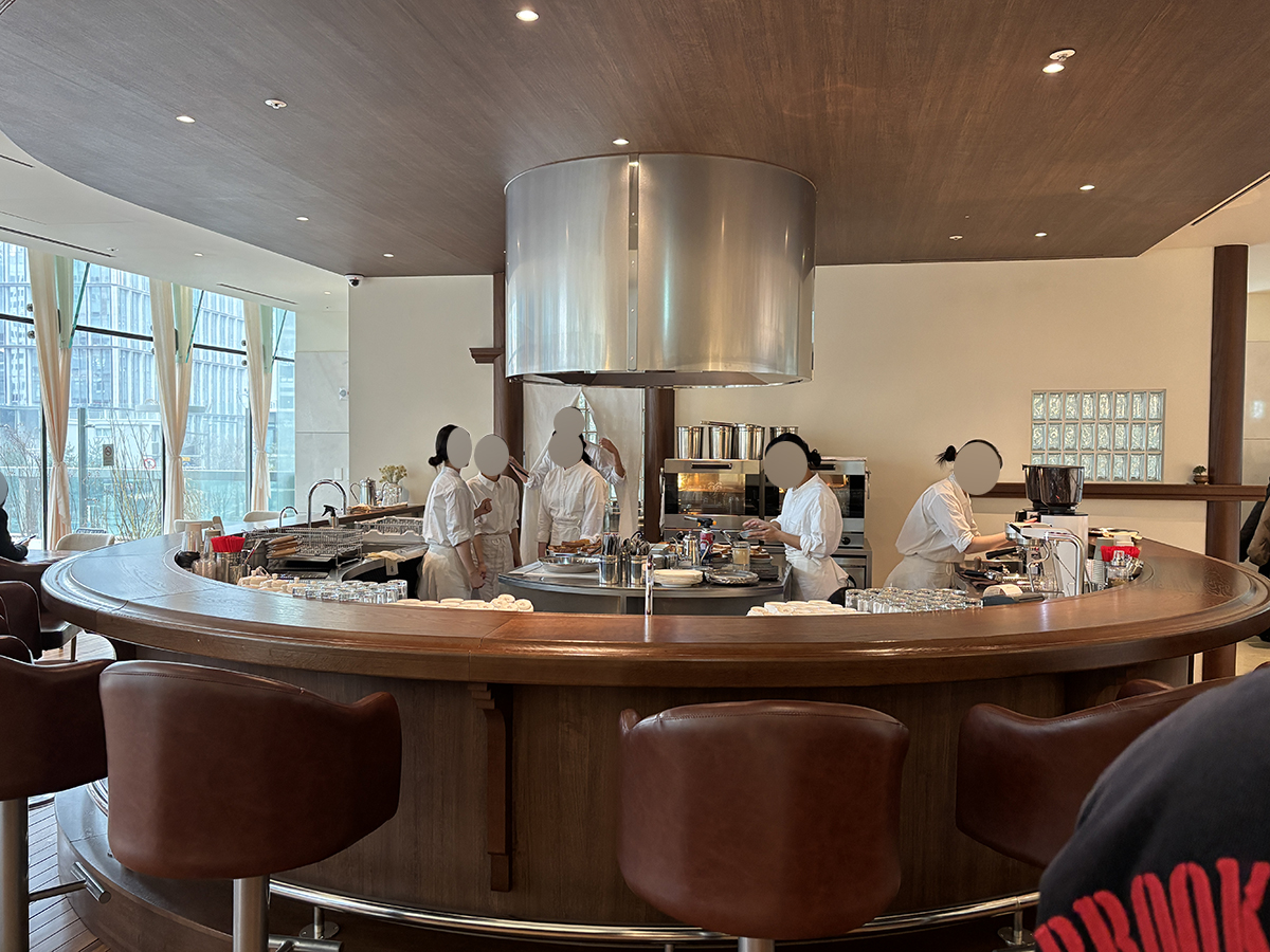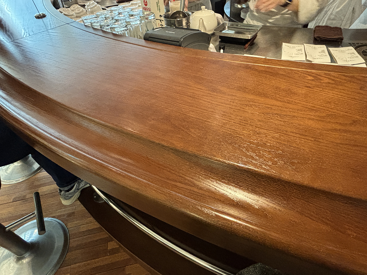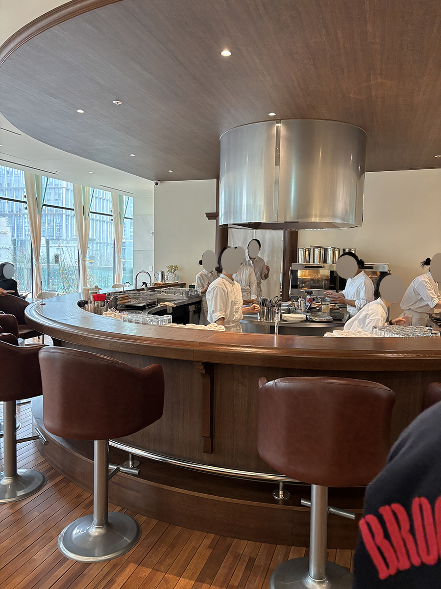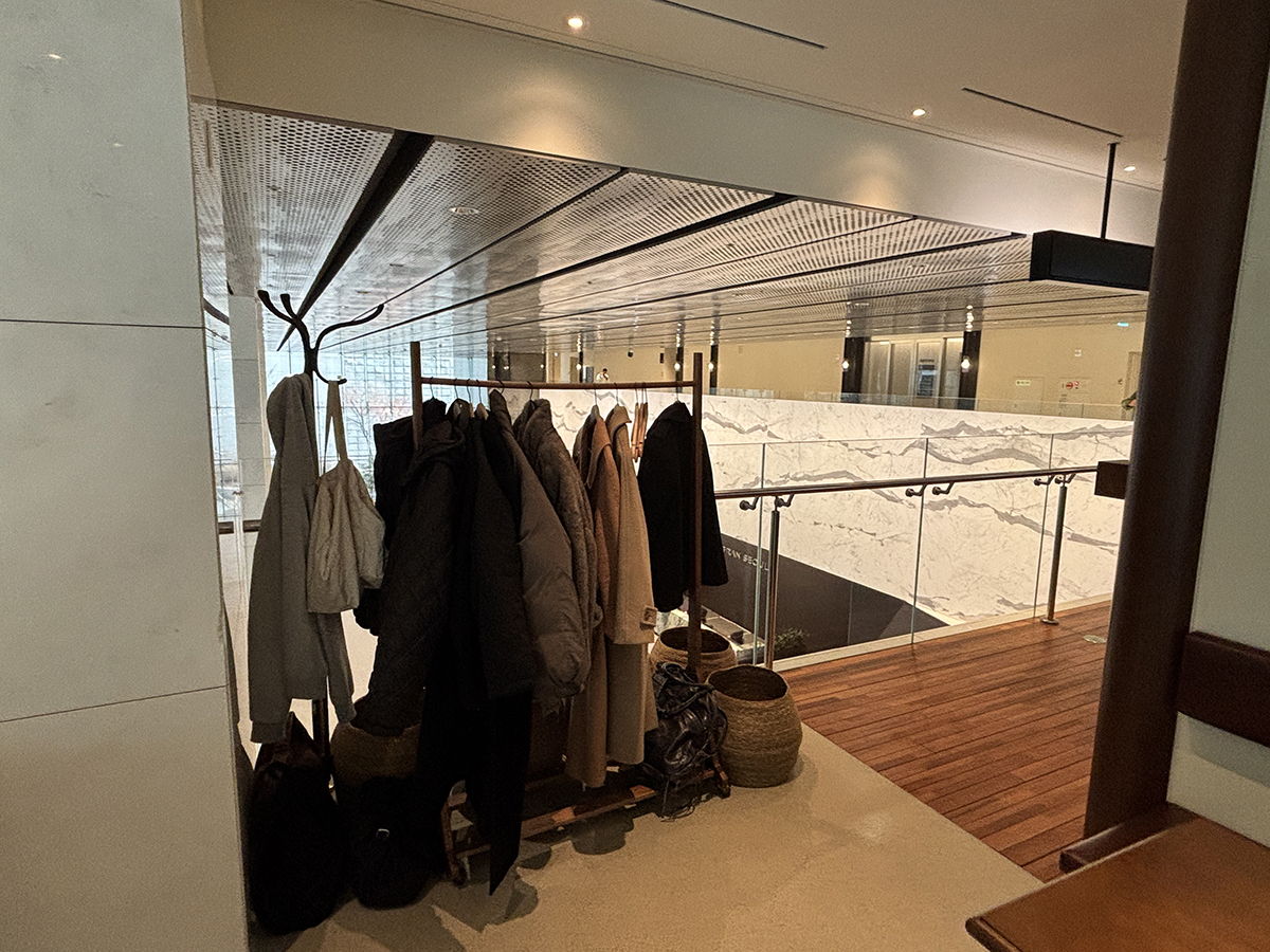 우리는 바테이블에 앉았고 안쪽에 옷걸이가 있어서 짐을 보관할 수 있다