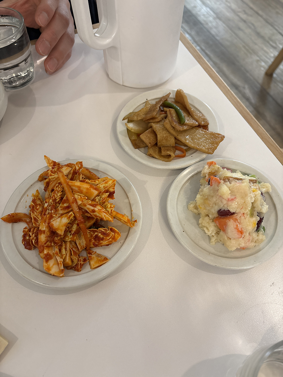 반찬은 배추 겉절이, 어묵볶음, 샐러드가 있는데