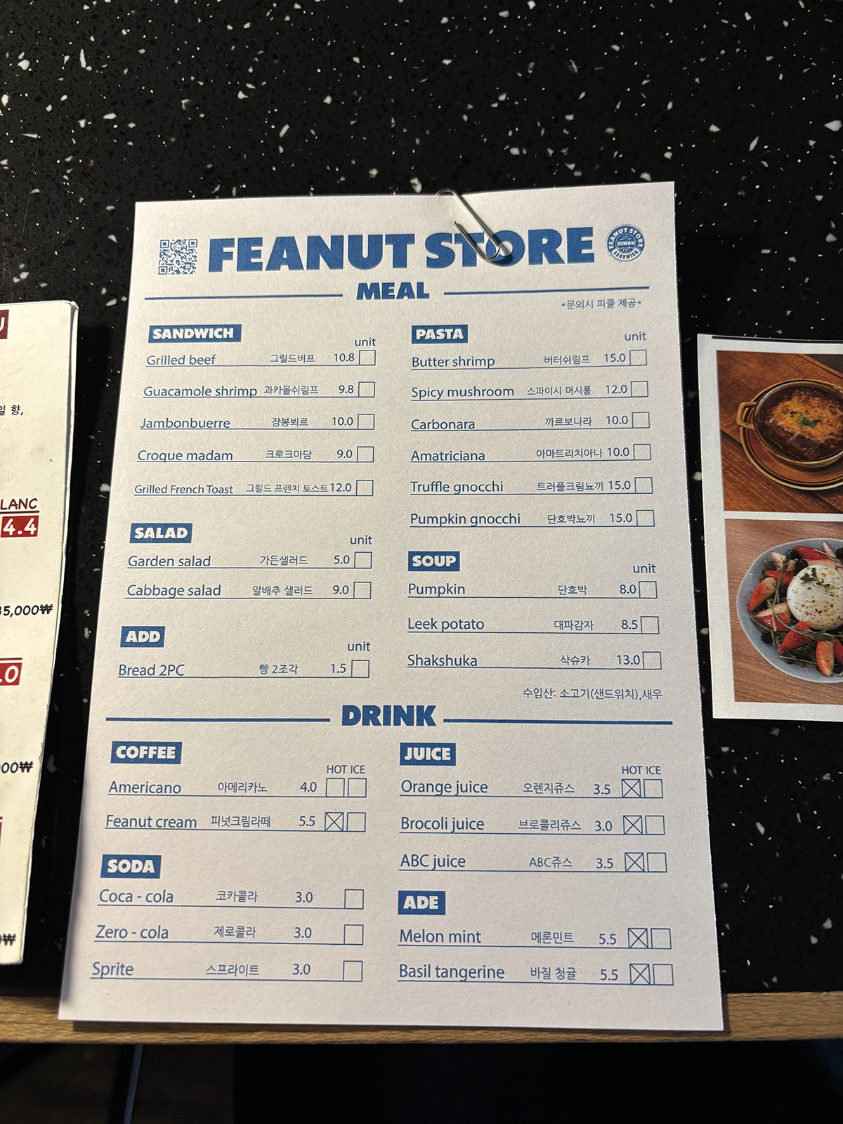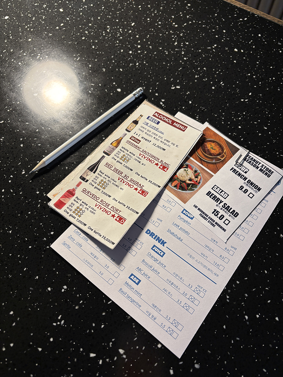 메뉴판은 종이로 주고 펜으로 체크해서 주문하면 된다