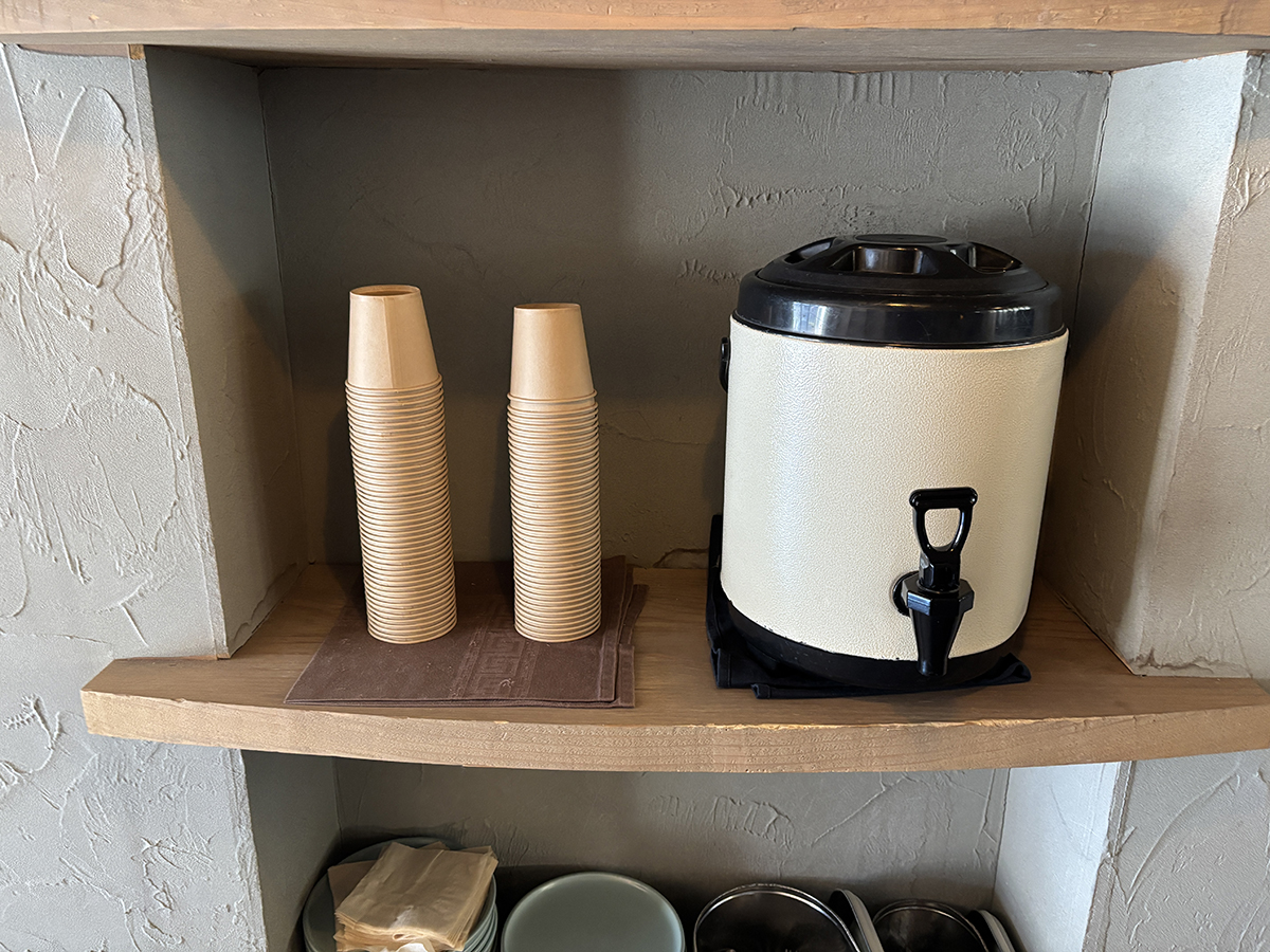 종이컵, 물, 티슈, 앞접시, 커트러리가 놓여 있음