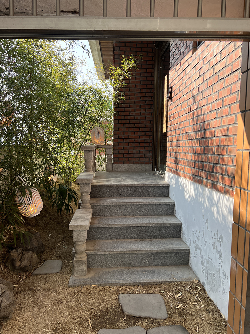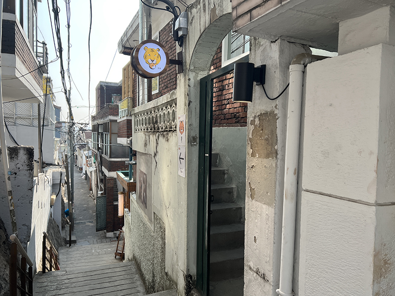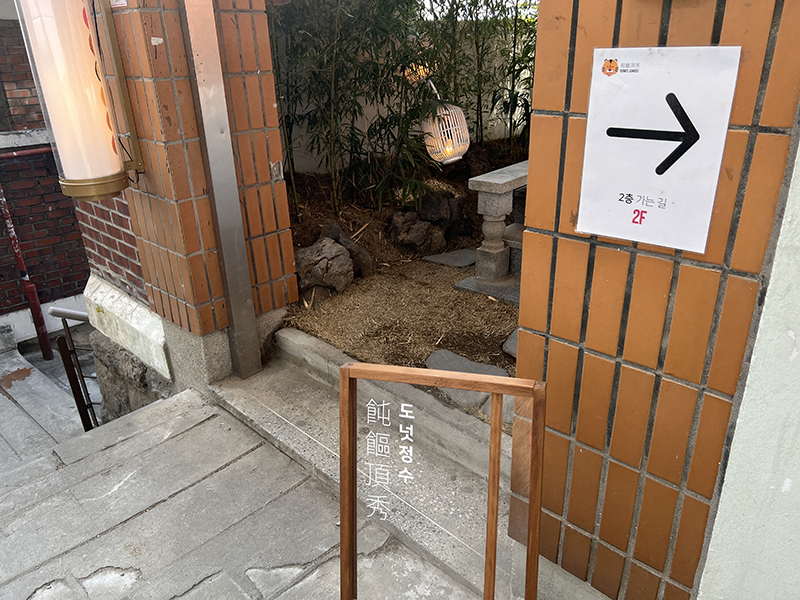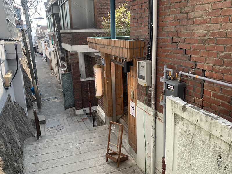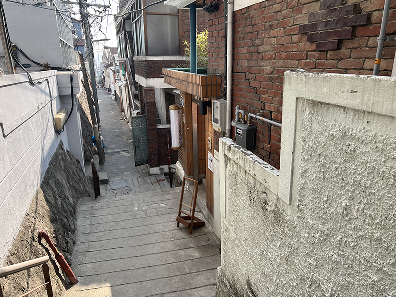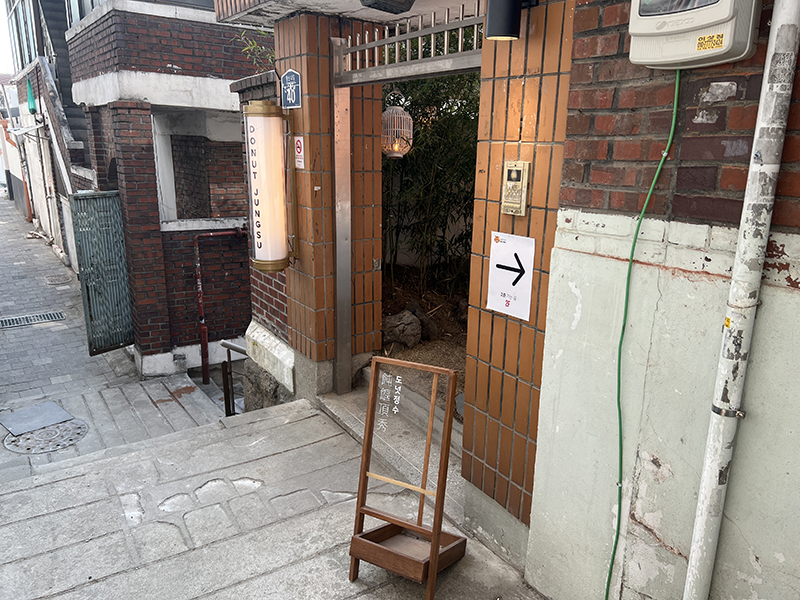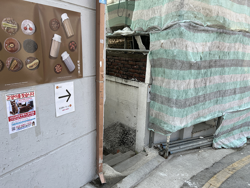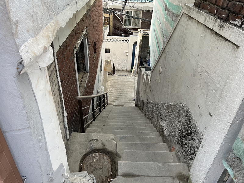 사진 방향으로 쭈욱 가면 창신도넛 가는 길이라는 종이가 붙은 벽과 그 옆에 계단길을 볼 수 있다