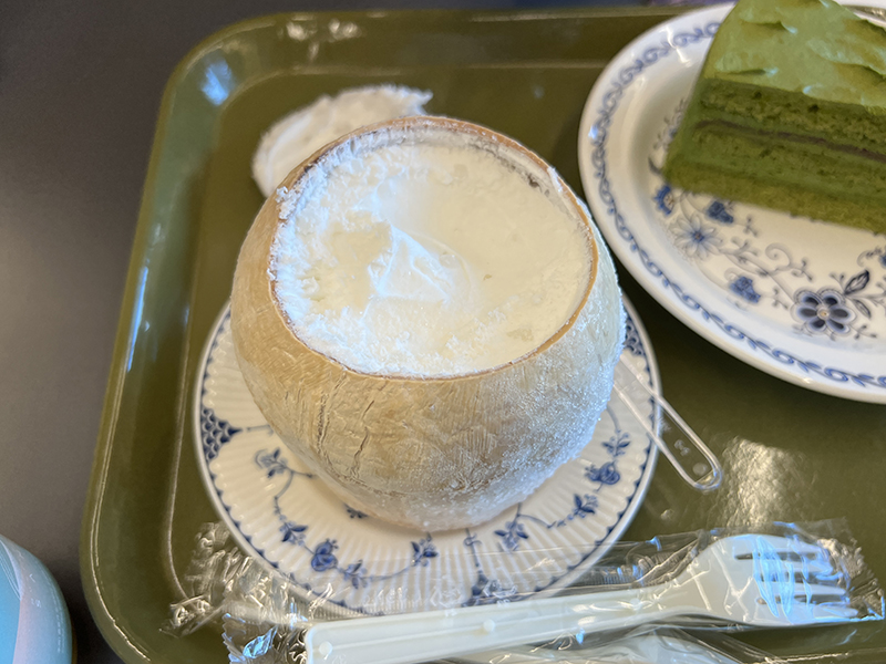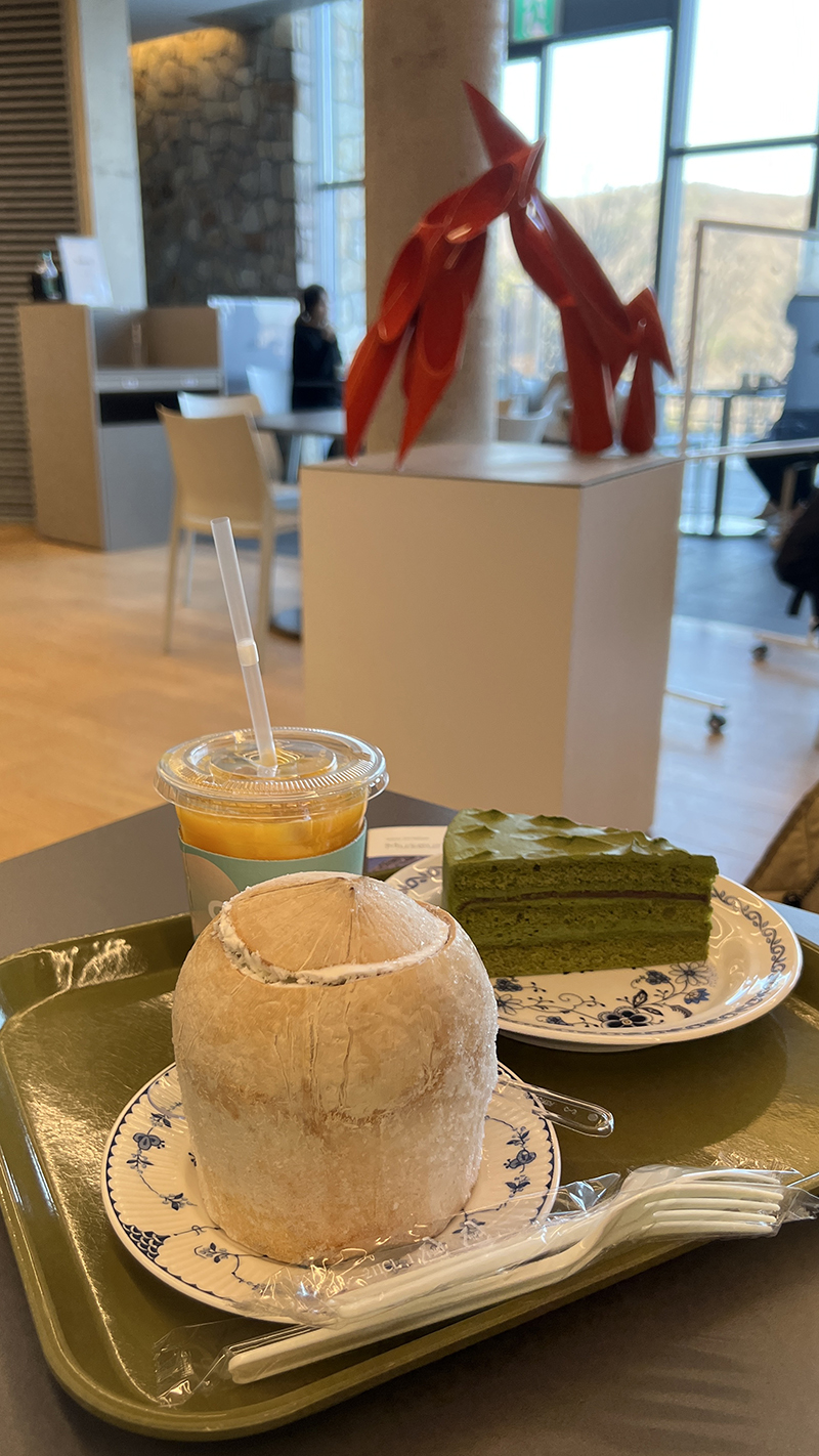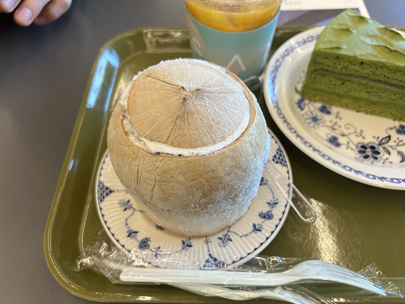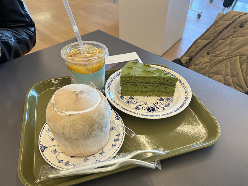 우린 코코넛아이스크림, 오렌지쥬스, 말차케이크를 주문했다