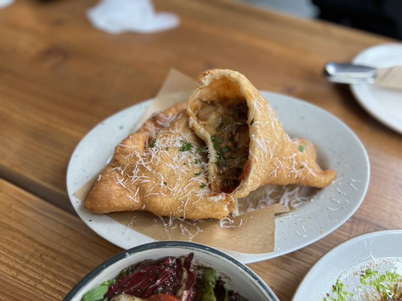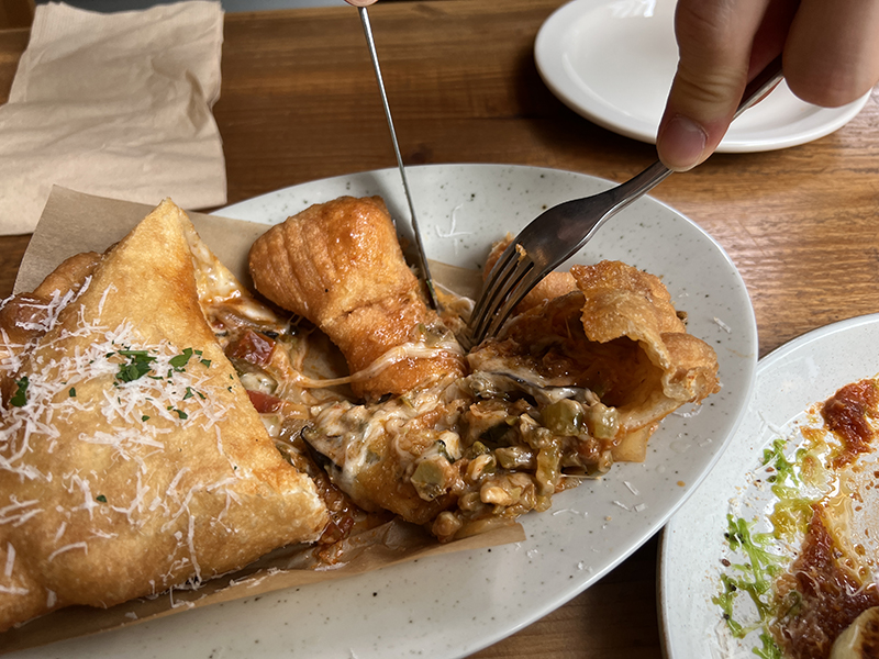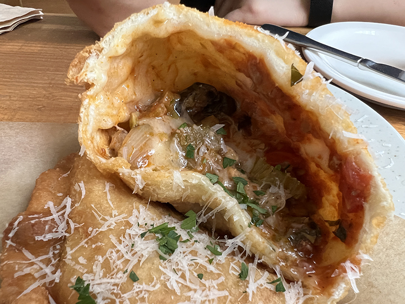가지와 새콤달콤하게 볶은 야채를 넣어 튀긴 반달모양의 피자