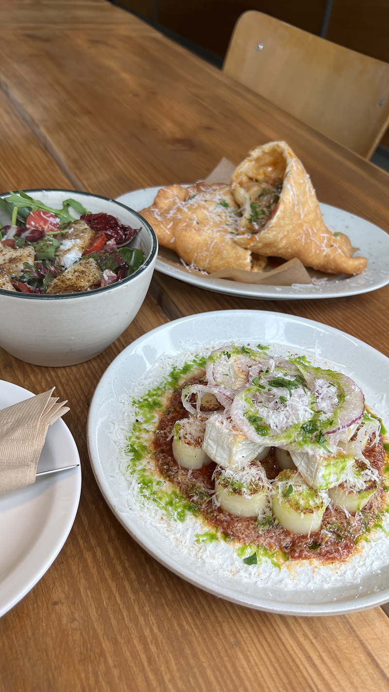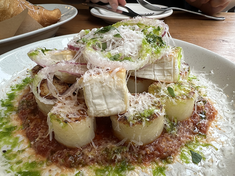 감자와 치즈를 이용한 반죽에 토마토 소스와 브리치즈를 올린 요리