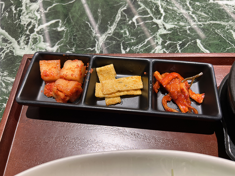 밑반찬으로는 무깍두기, 어묵볶음, 무말랭이!