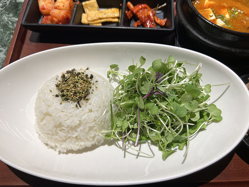 후레이크가 올려진 밥 옆에는 새싹, 생부추가 들어있고