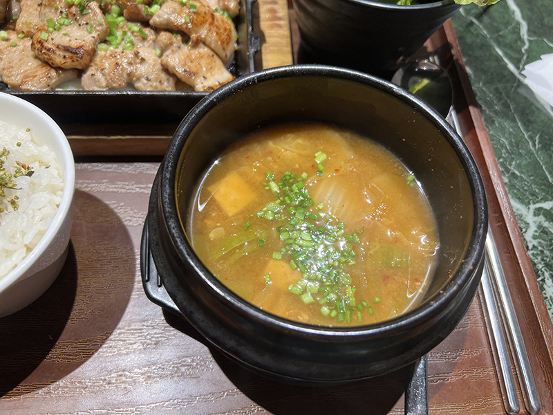 오동통한 삼겹살과 된장국, 쌈, 쌈장, 밑반찬이 나온다