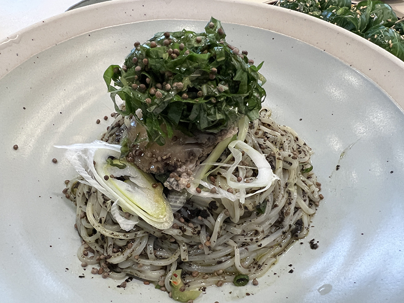 잘게 채썰린 깻잎이 동그랗게 올라간 들깨국수는 차가운 냉국수이다!