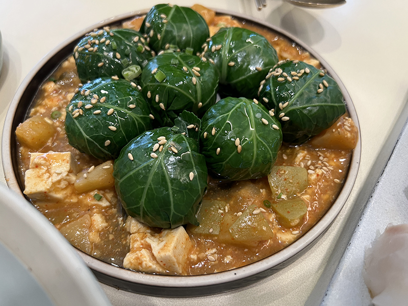 익힌 케일 잎 안에 밥이 들어있고 아래 강된장이 깔려 나오는 쌈밥!