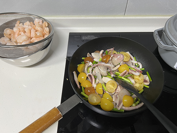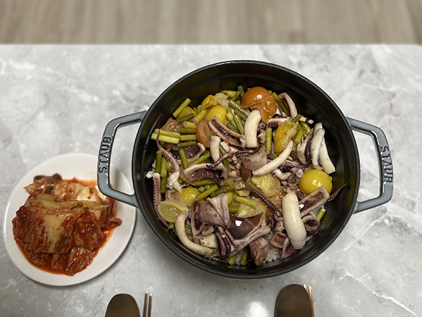 토마토 마늘쫑 오징어 볶다가 솥밥 위에 얹기!