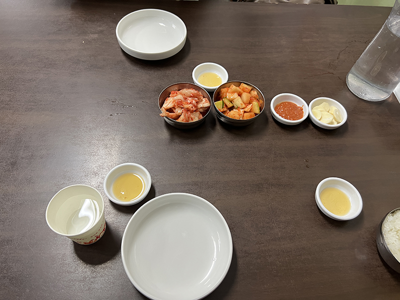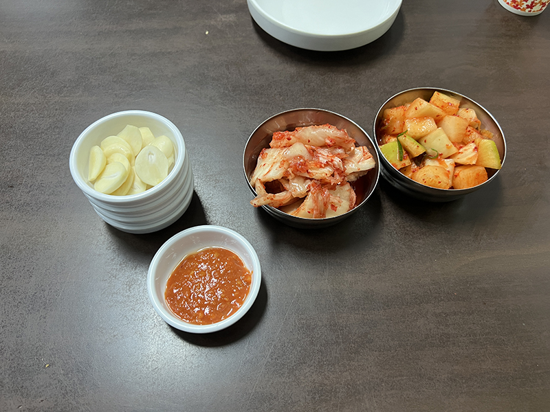 귀여운 사이즈의 그릇에 나온 김치와 깍두기, 그리고 육사시미 기름장과 쌈장, 마늘!