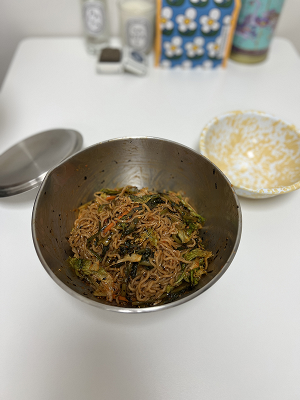 짐 싸가지고 같이 메밀국수 열무넣어 비벼 먹구
