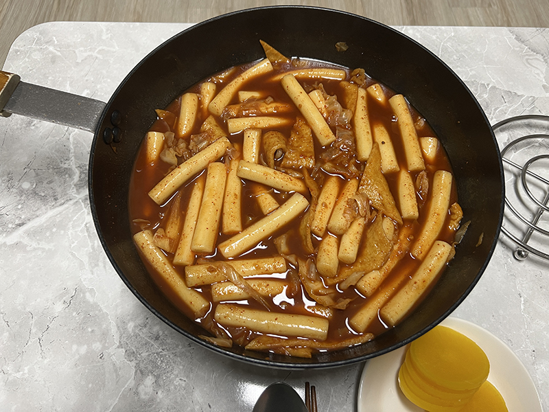 사진 찍는 사이 떡볶이와 오븐에 돌린 무침만두가 완료되어