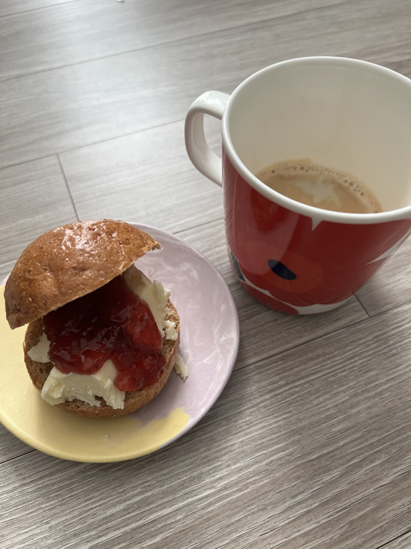 어제 안 먹고 가져온 빵에 딸기잼, 버터 발라서 커피랑 먹었다!